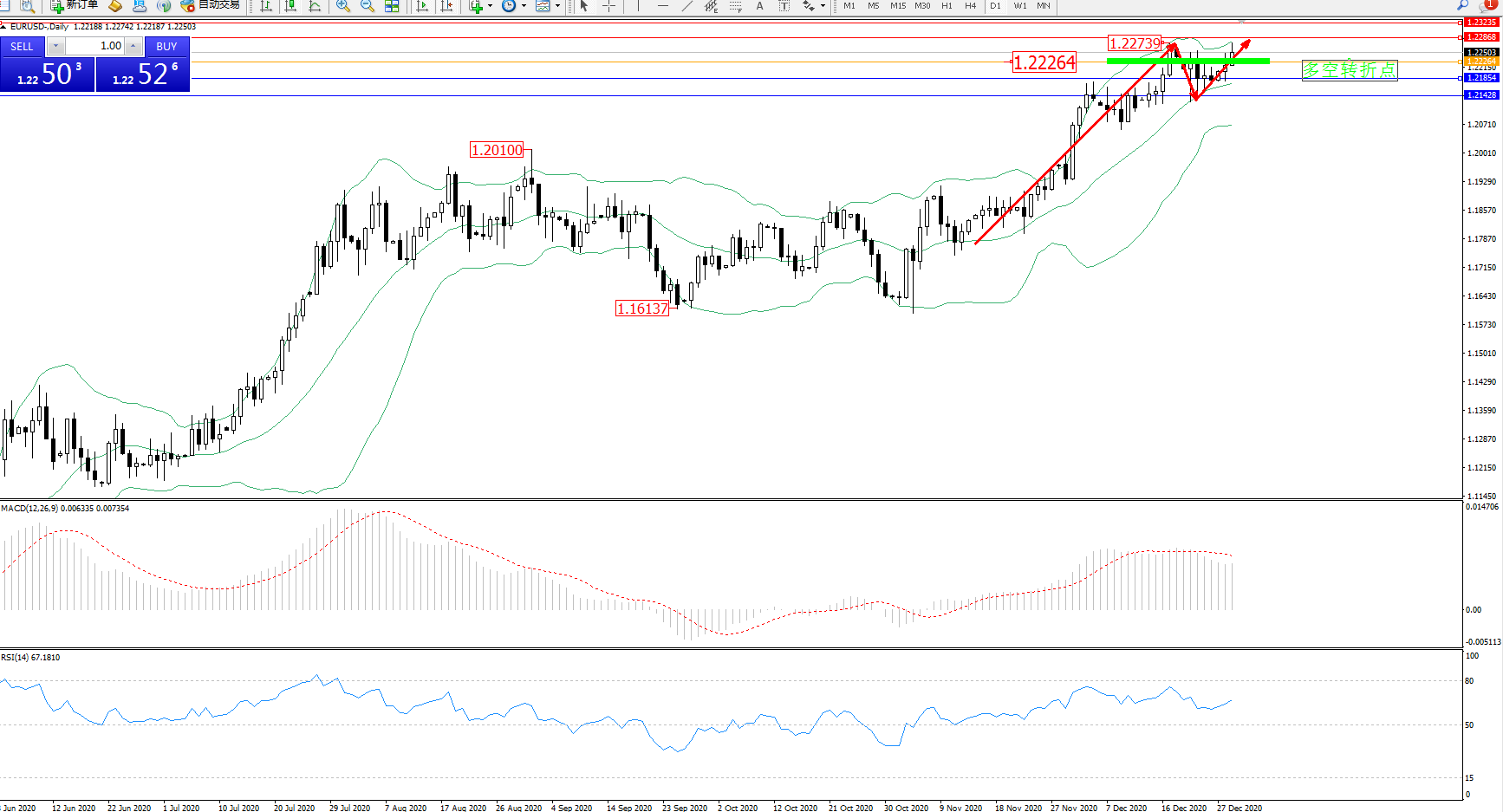 欧元兑美元小幅冲高至1.2262后整理,美元指数则一度创一周新低至89.98,,因为在美国国会推进加强版疫情援助方案后,投资人受到鼓舞冒险意愿升高,打压了美元的避险需求。美国众议院周一表决通过将疫情援助支票金额从600美元提高逾两倍至2000美元,并将议案送交参议院表决。随着伦敦市场周二结束圣诞假期,恢复交易,交易员正在消化欧盟与英国上周在圣诞节前夕达成贸易协议的结果,对于化解“无协议”风险松了一口气。对近期发现一种传播速度更快的新型冠状病毒的担忧帮助限制了美元盘中的下跌。除此之外,美国国债收益率的强劲上扬也帮助提振了对美元的需求。这被视为欧元兑美元从高位回落的关键因素之一。