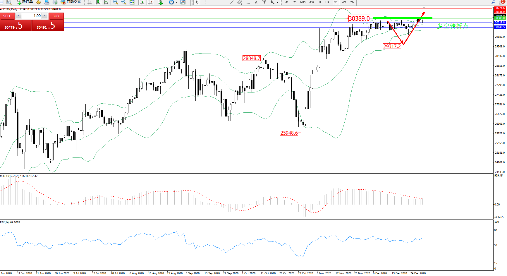 道琼斯指数12月31日(周四)收盘上涨196.90点,涨幅0.65%,报30606.48点。2020年美股最后一个交易日,道指收涨约200点,道指2020年累涨超7%,大幅震荡逾12000点。美国股市两项主要指数在今年最后一个交易日的清淡市况中收创纪录高位,道指成分股中,苹果表现最佳,全年涨超80%,波音全年跌近34%,为表现最差的成分股。金融股为领涨板块之一,能源股下跌;该指数全年累计上涨逾16%,推升了估值,市场预期疫苗广泛接种、货币和财政刺激措施将推动经济复苏,提振企业盈利前景。经济前景随着新冠疫苗推出而改善、美国极低的利率、和正在进行的美联储购债计划,削弱了美元的吸引力。