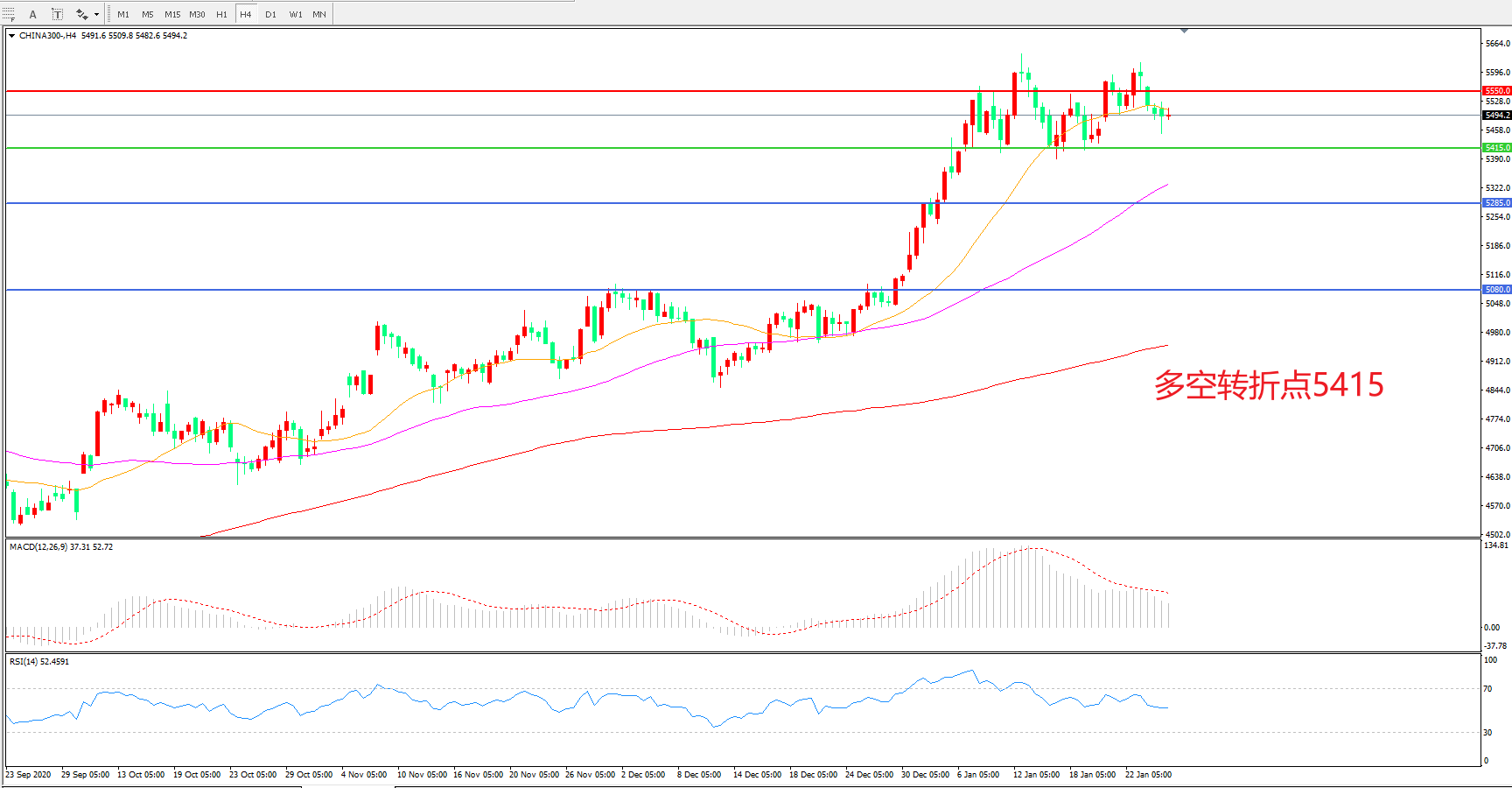 4小时图看,沪深300延续窄幅震荡走势,多空博弈异常胶着,5415成为下方支撑,5550成为上方阻力,均线系统逐渐走平,MACD红柱缩短,RSI指标走平,日内延续震荡概率较大。