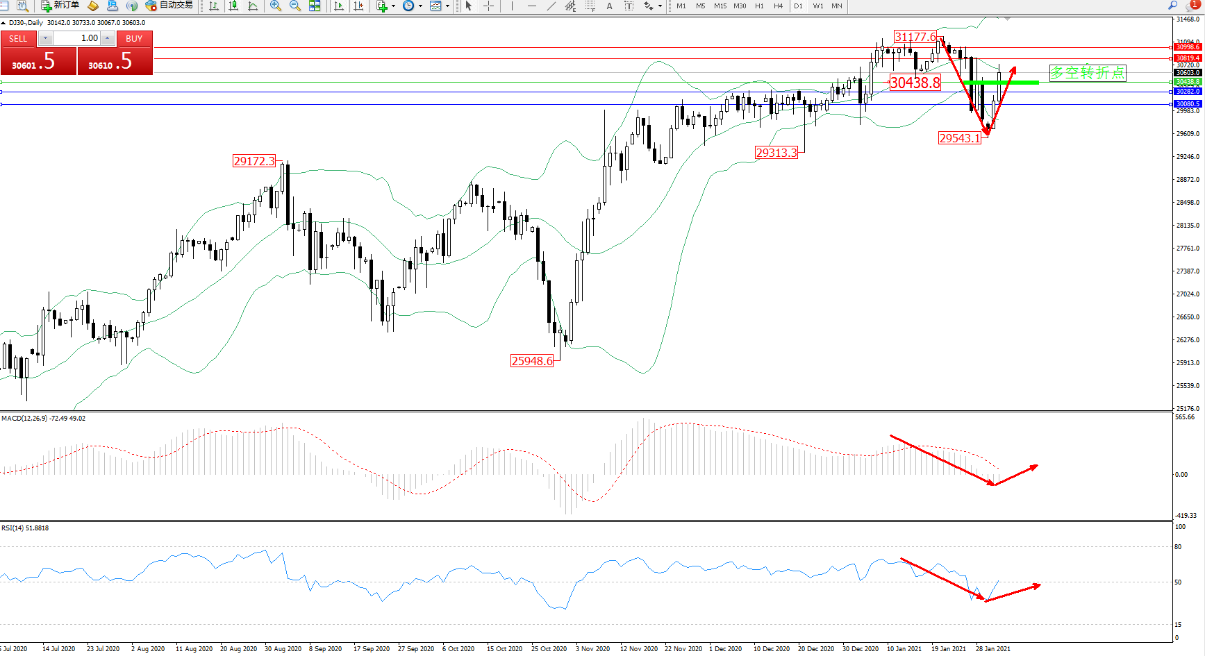 道琼斯指数DJ30—— 日K线图显示: