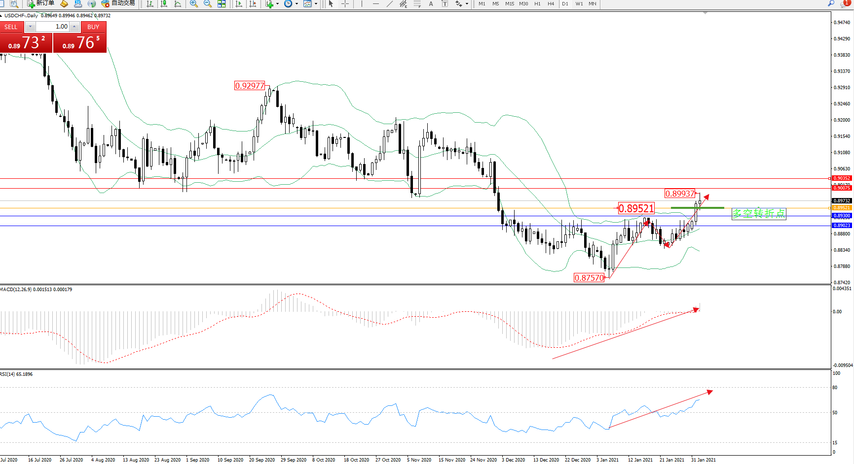 交易策略:0.89521上方看涨,目标0.90075、0.90352