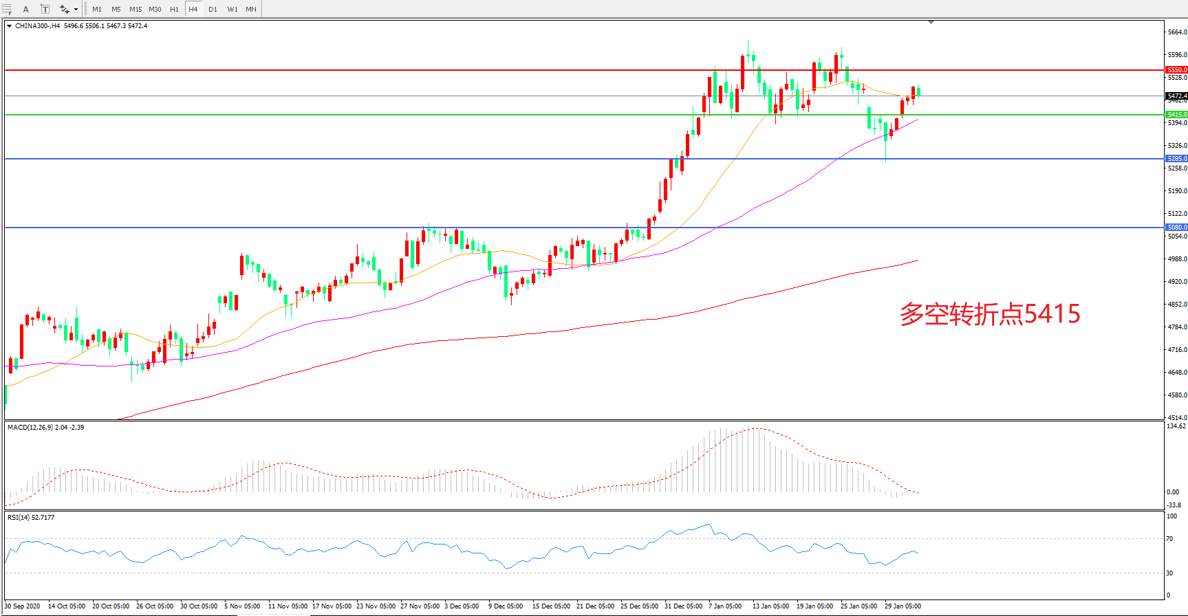 4小时图看,沪深300回踩55周期均线后震荡反弹,短期走势有所回暖,5415成为下方支撑,MACD绿柱缩短,RSI指标走平,日内延续震荡概率较大。