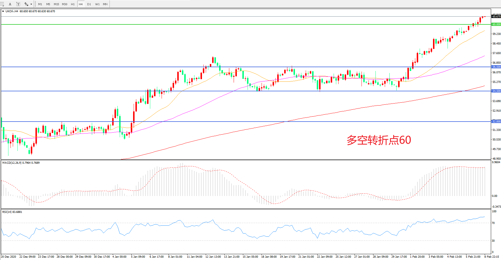 4小时图看,油价连续拉升,整体表现偏强,60阻力被快速突破,多头趋势已经形成,MACD红柱增加,RSI指标向上,日内延续上行概率较大。