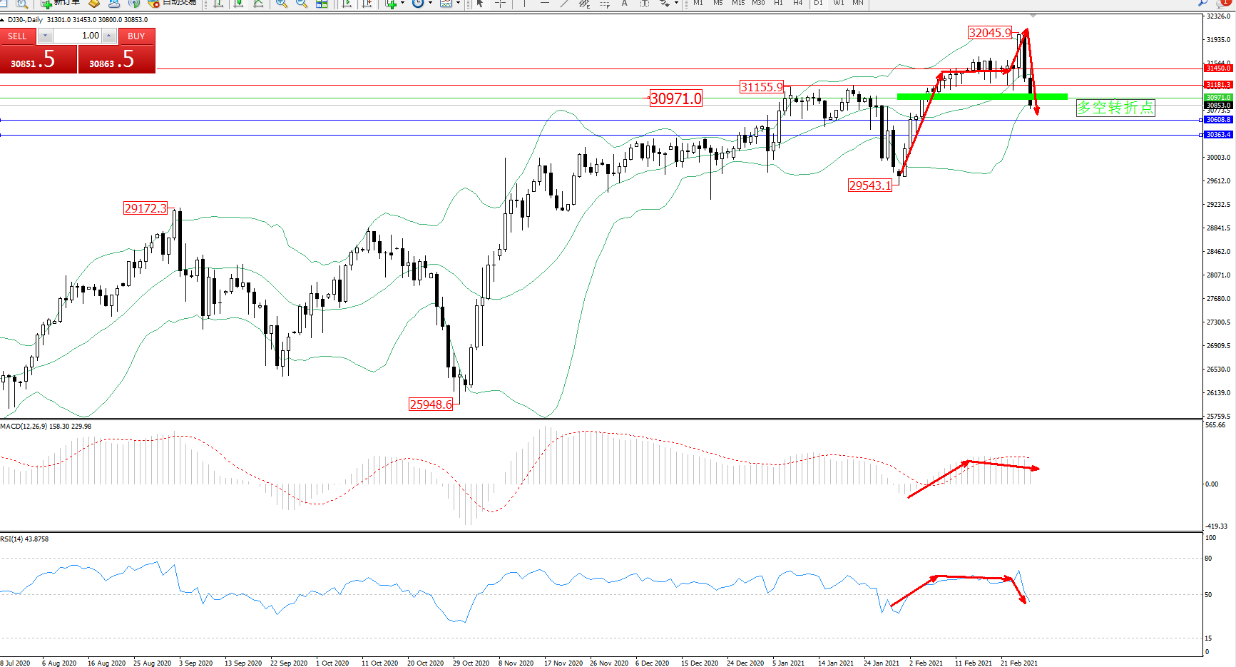 技术点评:多头动力延续布林带指标中上轨区间持续震荡上扬态势良好,高位抵达32045附近节点遇阻,急速反转下挫,抵达布林带指标下轨附近节点后有继续向下移动态势,布林带指标呈收口走势持续中,关注下轨上側附近关键节点,MACD指标处于多头区域高位整理后有缓慢下移走势,RSI指标处于多头区域整理平移后反转下挫至50均衡线下侧整理;