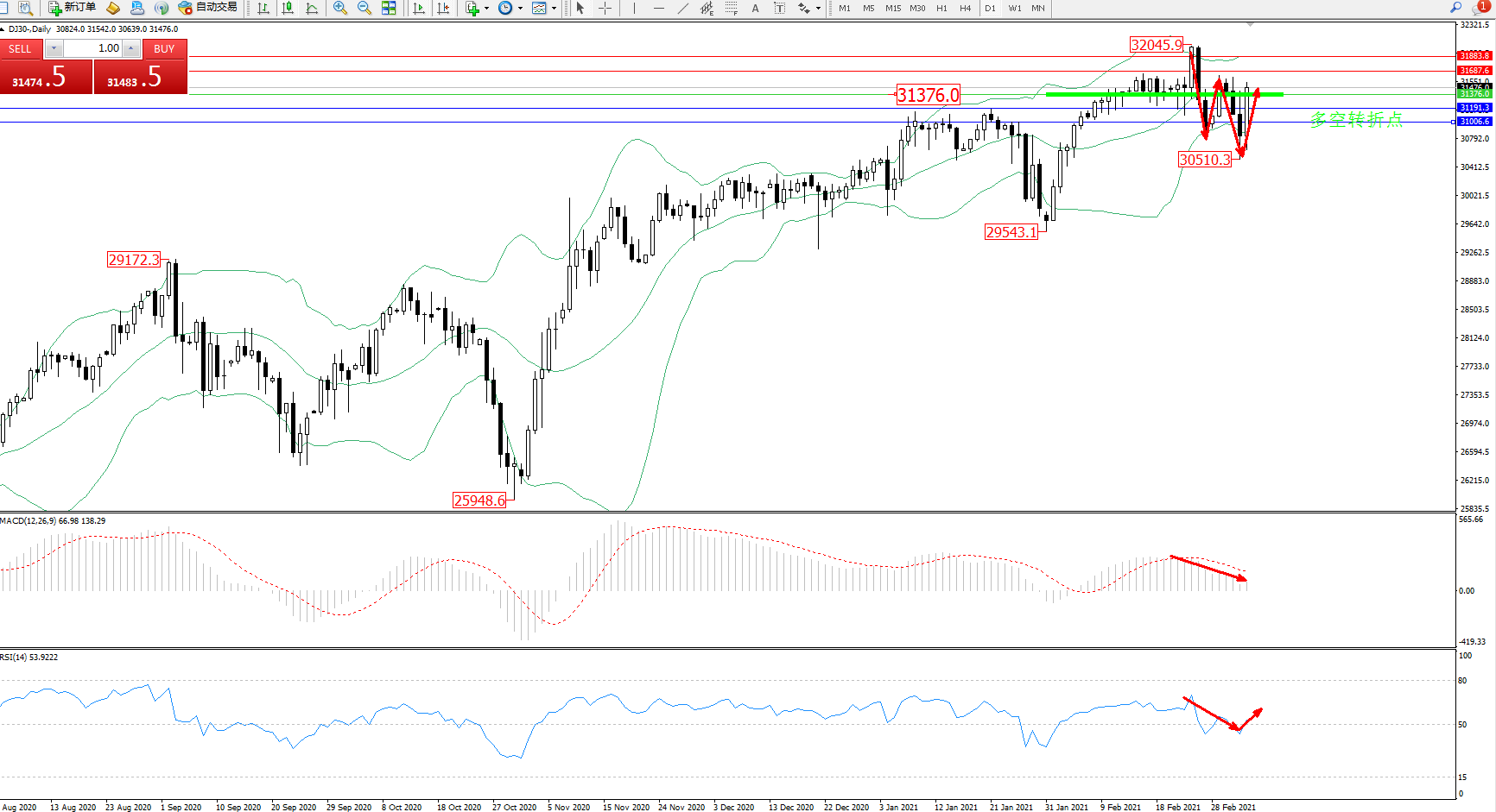 技术点评:高位空头动力伺机入场,纠结于布林带指标通道维持宽幅震荡走势中,低位下破布林带指标下轨至30510位置节点后得到支撑,多头动力强势拉升,突破中轨附近节点后开始整理,布林带指标呈收口走势后开始有缓慢张口迹象,关注中轨附近节点,MACD指标处于多头区域维持整理缓慢下移,即将触及0轴线附近节点,RSI指标处于50均衡线附近节点维持窄幅整理中;