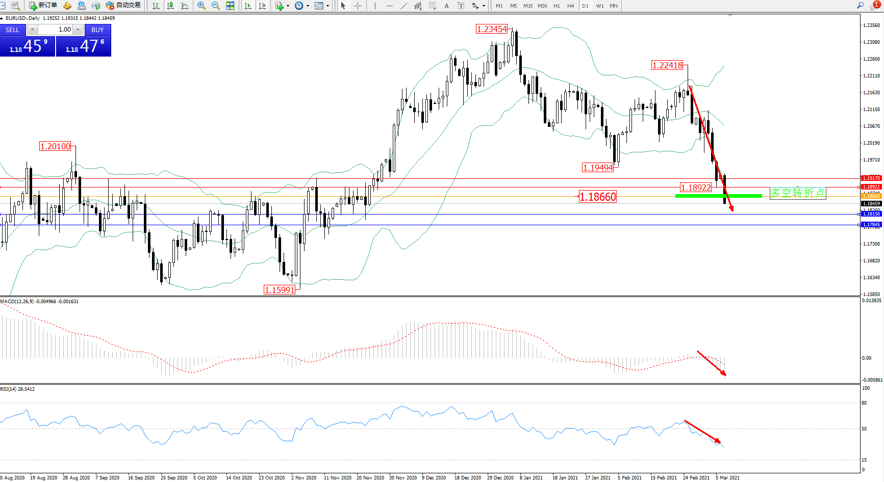 交易策略:1.18660下方看跌,目标1.18150、1.17845