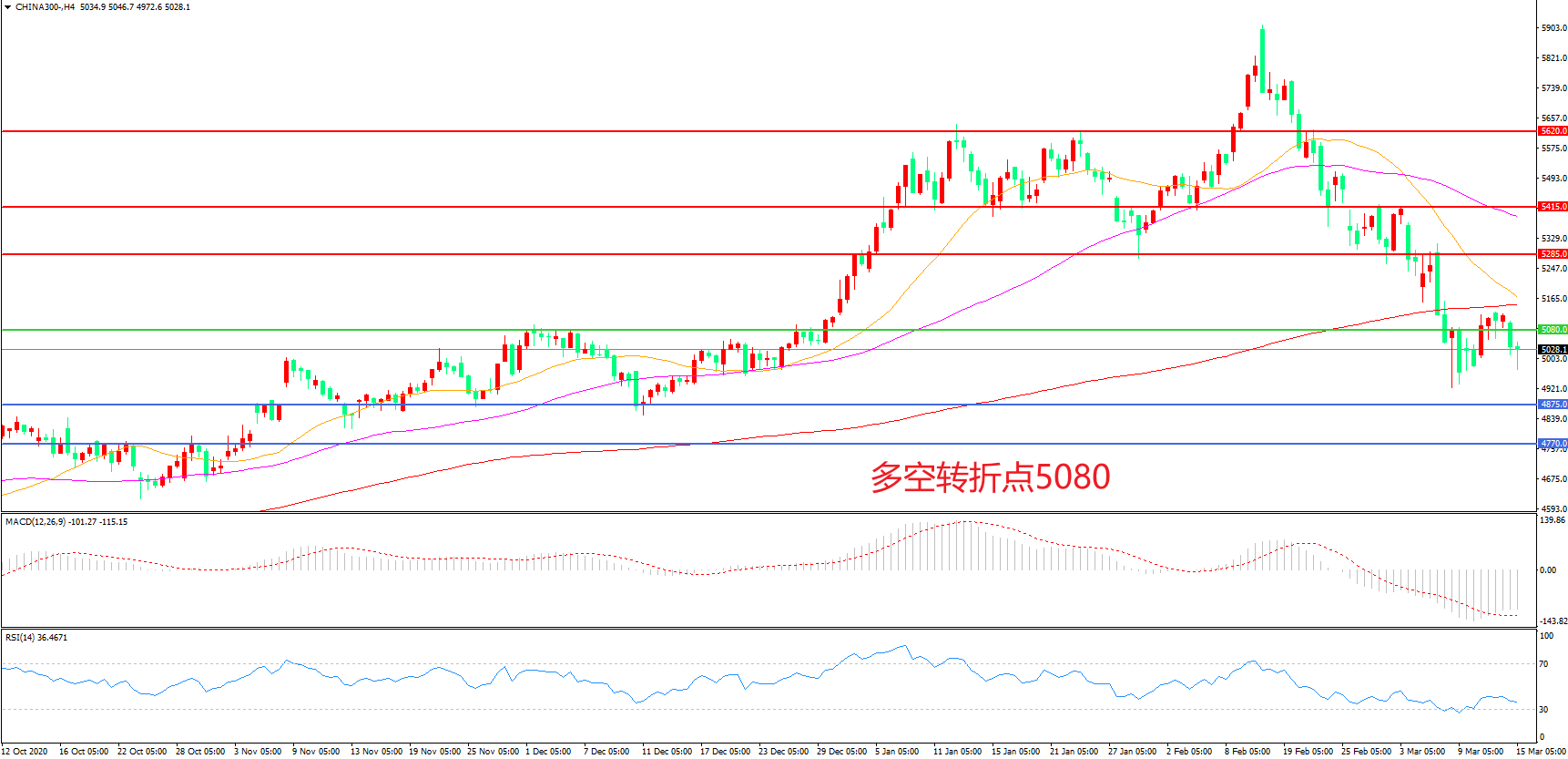 4小时图看,沪深300延续低位震荡,触碰200周期均线后再度大跌,5080成为多空分水岭,MACD绿柱增加,RSI指标走平,日内延续震荡概率较大。