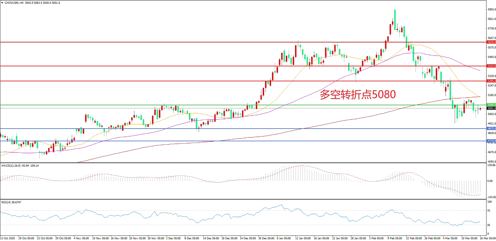 4小时图看,沪深300延续低位震荡,整体波幅不大,200周期均线成为短期多空分水岭,21周期均线出现下穿,MACD绿柱增加,RSI指标走平,日内延续震荡概率较大。