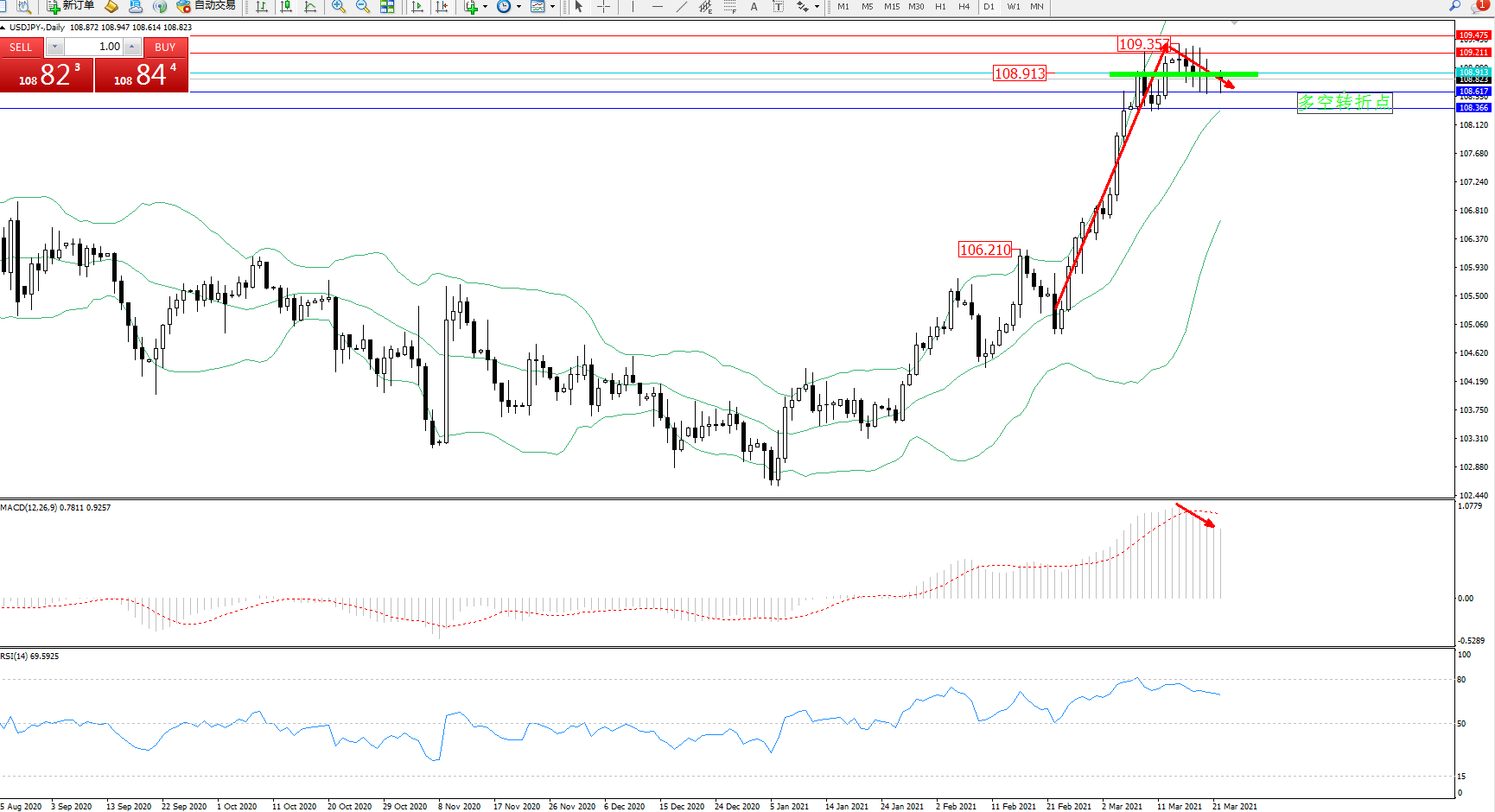 美元兑日元跌0.03%至108.85,盘中下跌0.3%至108.51;土耳其总统撤换央行行长的做法引发了新兴市场汇市的连锁反应,并令避险日元重新因为资金涌入得到买需。然而,这并未改变市场的大局。投资者仍然在评估日本东京奥运会确认不接待境外来客所带来的负面冲击,这势必令日元汇价后市面临额外持续压力。美元兑日元后市仍有蓄力重返109关口的动能,市场正在观望全球疫情及经济的下一步行动。此前传闻称美国政府之后还会有更大力度的基建刺激措施出炉,一旦如此,美债收益率势必续升,并带动美元兑一篮子非美货币继续走强。