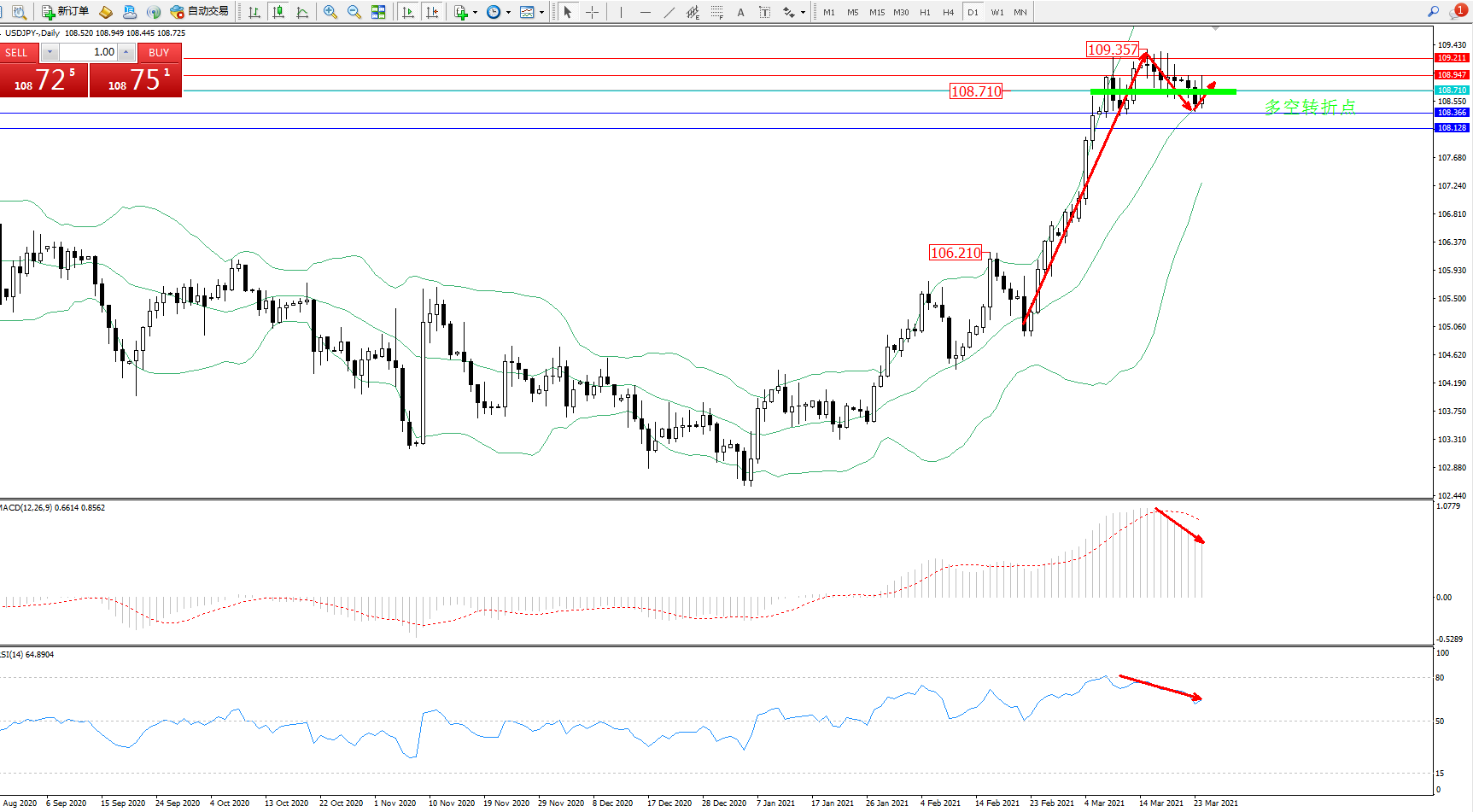 技术点评:多头动力延续布林带指标上轨附近节点持续震荡上扬,高位抵达109.357附近节点后遇阻震荡回撤,触及中轨附近节点后得到短暂支撑开始震荡,堵头动力有伺机入场迹象,布林带指标呈收口走势中,MACD指标处于多头区域弱势下行,RSI指标处于多头区域维持整理向下移动中;