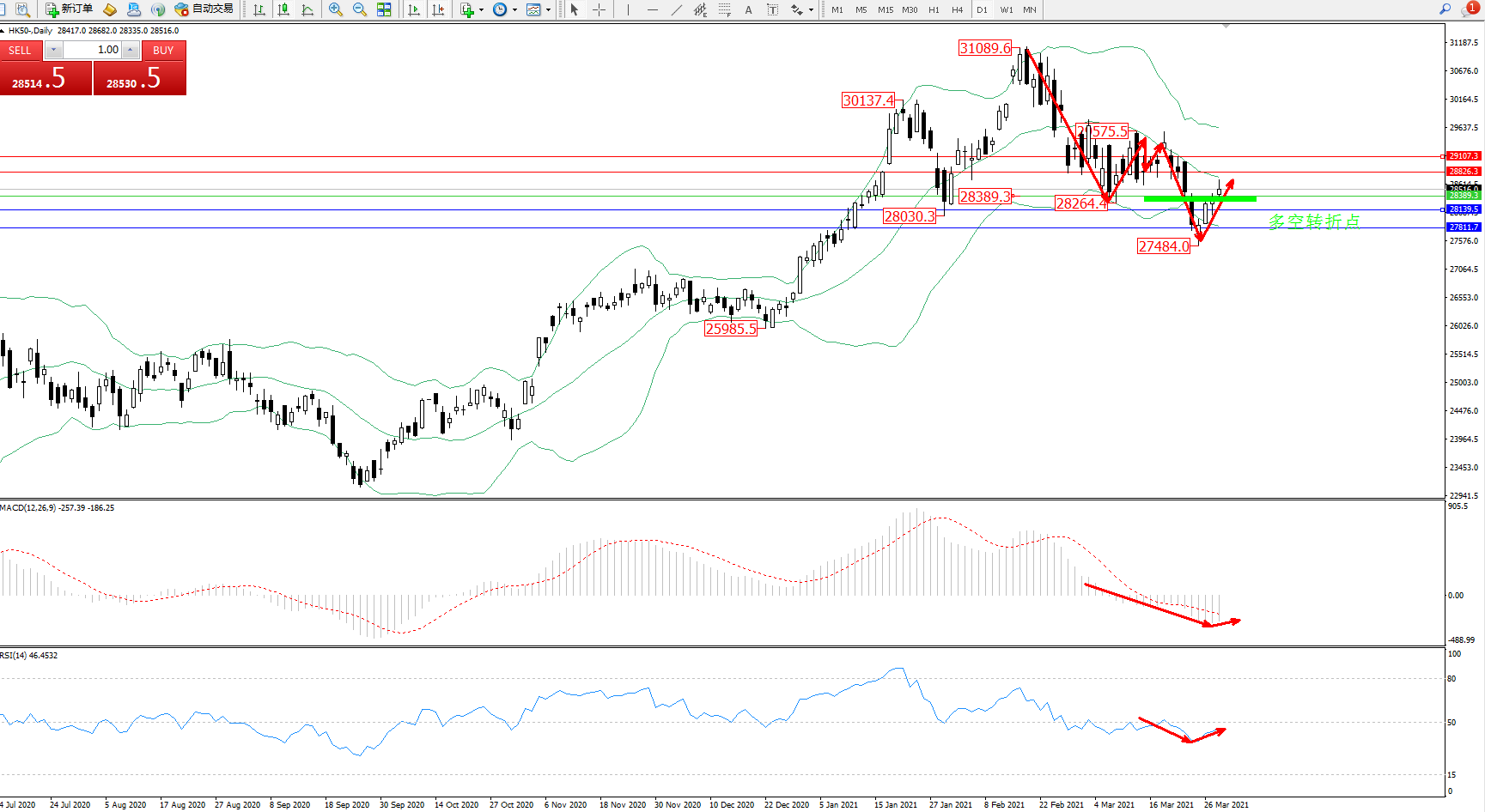 技术点评:空头动力延续布林带指标探通道中下轨区间持续震荡下行,跌破下轨抵达27484位置后得到支撑开始反转上移,多头动力伺机入场,即将触及中轨附近节点,布林带指标呈张口走势后开始有收口迹象,MACD指标空头动力维持震荡缓慢下行至0轴线下方空头区域不断下行,RSI指标处于50均衡线下方维持窄幅整理中;