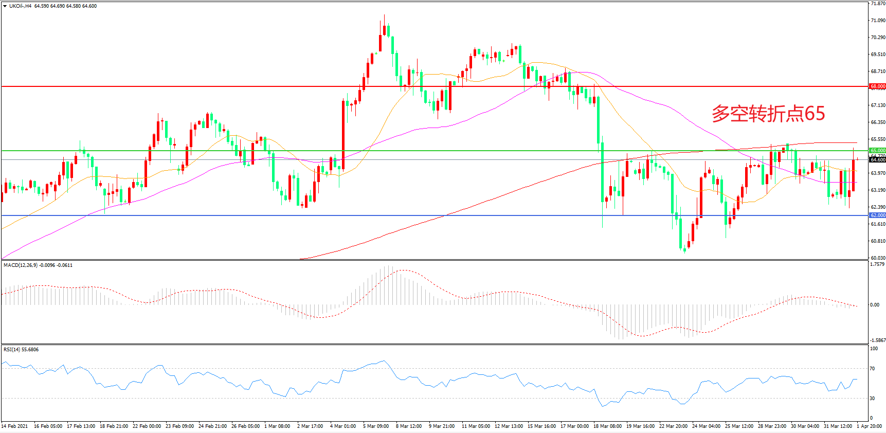 4小时图看,油价延续宽幅震荡走势,62美元成为下方支撑,65美元成为上方阻力,均线系统逐渐走平,MACD红柱缩短,RSI指标走平,日内延续震荡概率较大。