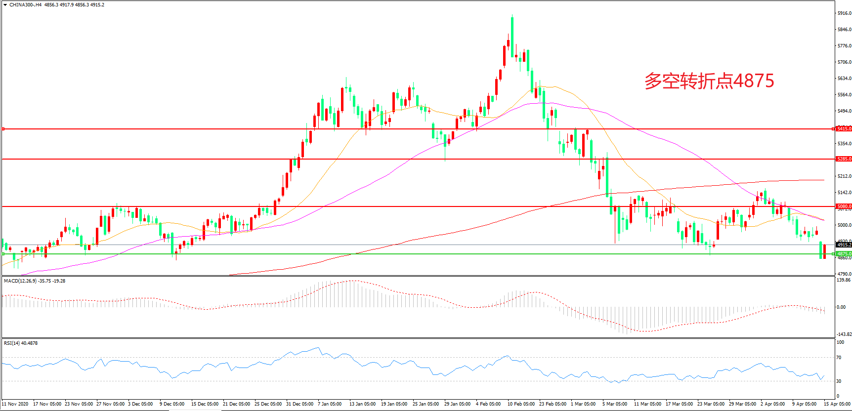 4小时图看,沪深300延续低位震荡,整体表现相对低迷,均线系统粘合成为上方阻力,4875成为多空分水岭,MACD绿柱增加,RSI指标走平,日内延续震荡概率较大。