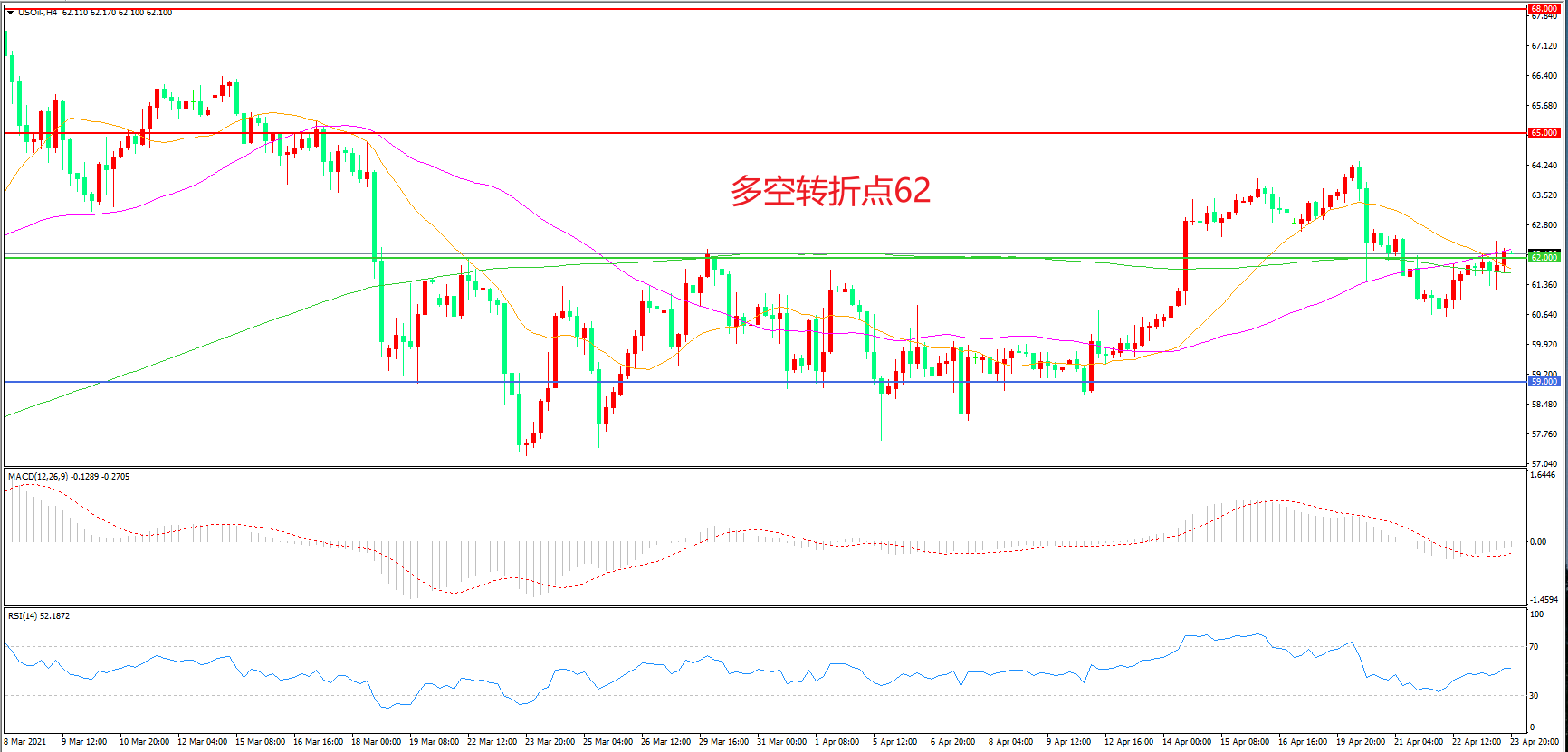 4小时图看,油价回踩60美元附近后小幅反弹,短期走势有所回暖,均线系统逐步粘合,MACD绿柱缩短,RSI指标向上,日内延续震荡概率较大。