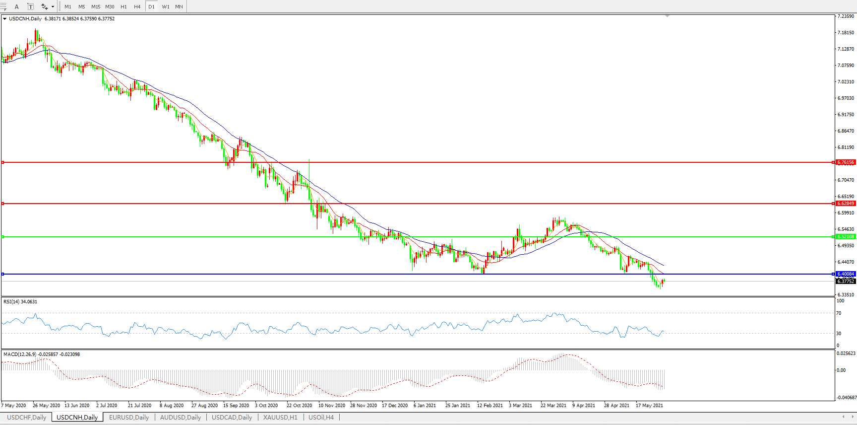 美元兑人民币USDCNH 日线图: