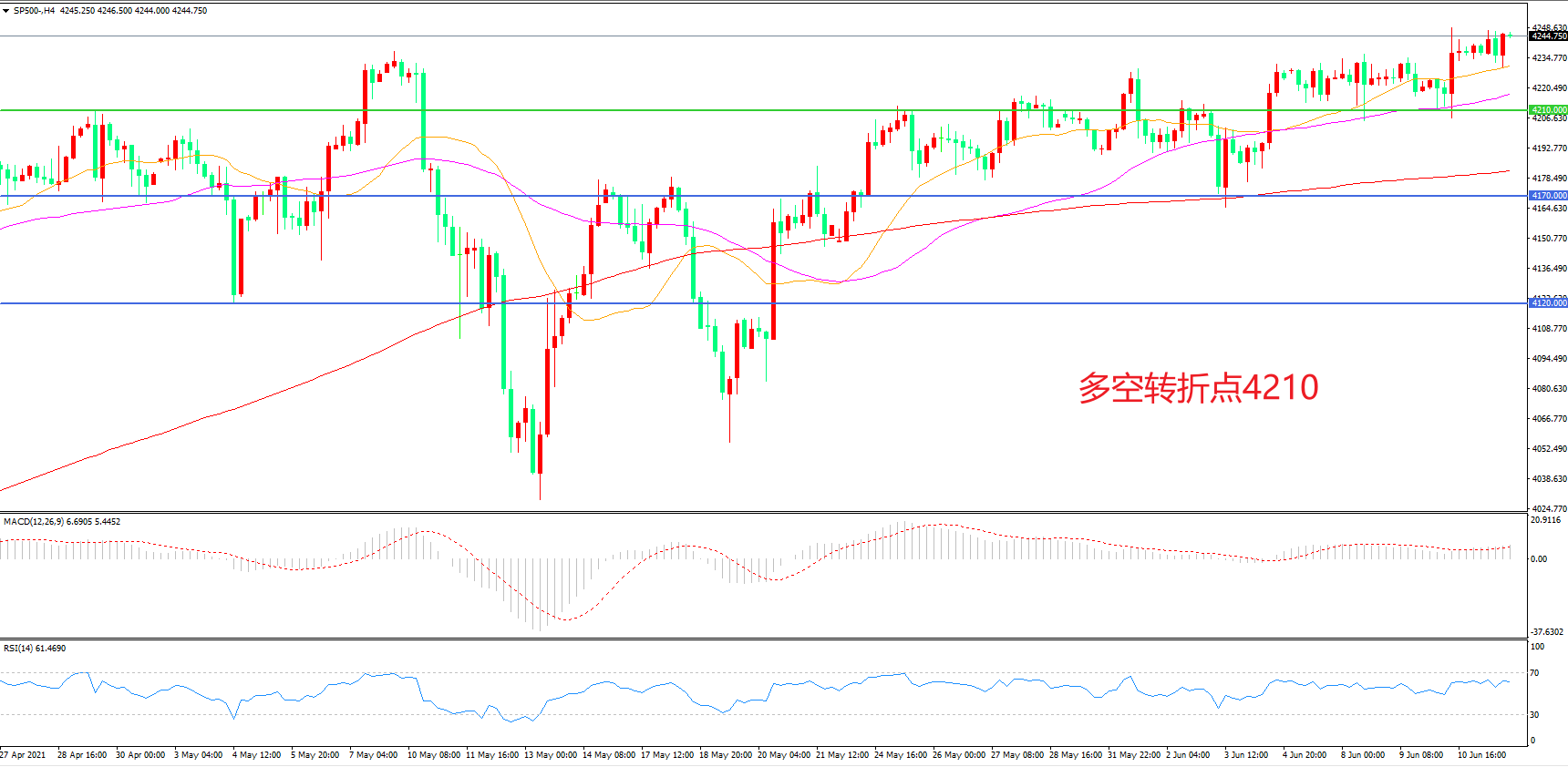 4小时图看,标普500延续震荡,短期表现较强,均线系统走平,4210成为短期支撑,MACD红柱增加,RSI指标走平,日内震荡上行概率较大。