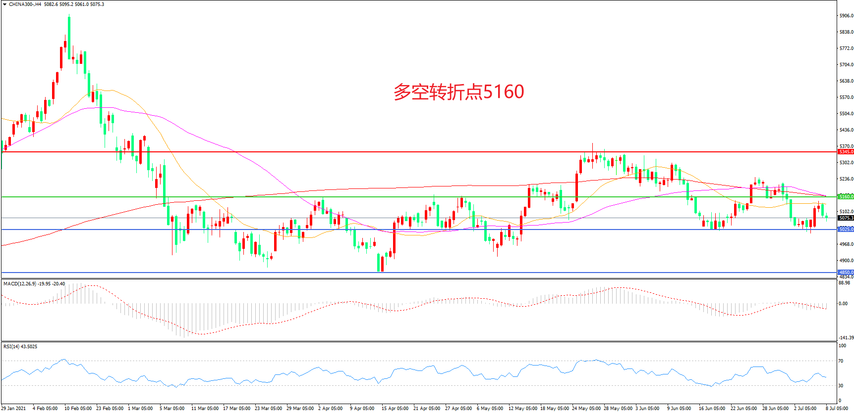 4小时图看,沪深300延续区间震荡形态,5025成为下方支撑,5160成为上方阻力,高点逐渐降低,MACD绿柱缩短,RSI指标走平,日内延续震荡概率较大。