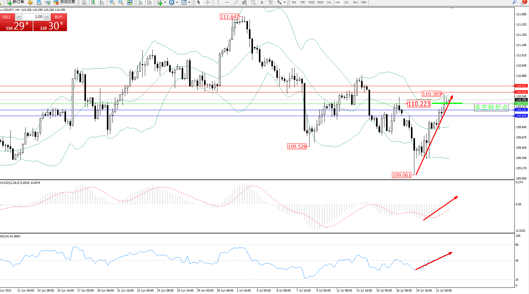交易策略:110.223上方看涨,目标110.410、110.512