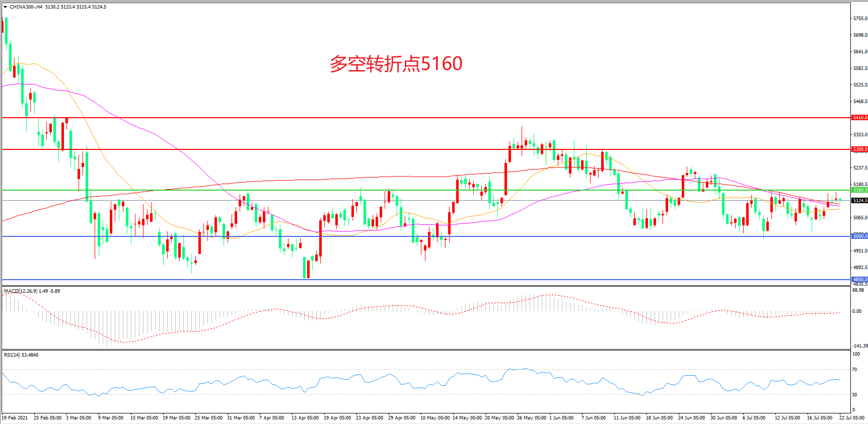 4小时图看,沪深300延续区间震荡形态,5160成为上方阻力,5000点成为下方支撑,均线系统逐渐走平,日内震荡上行概率较大。