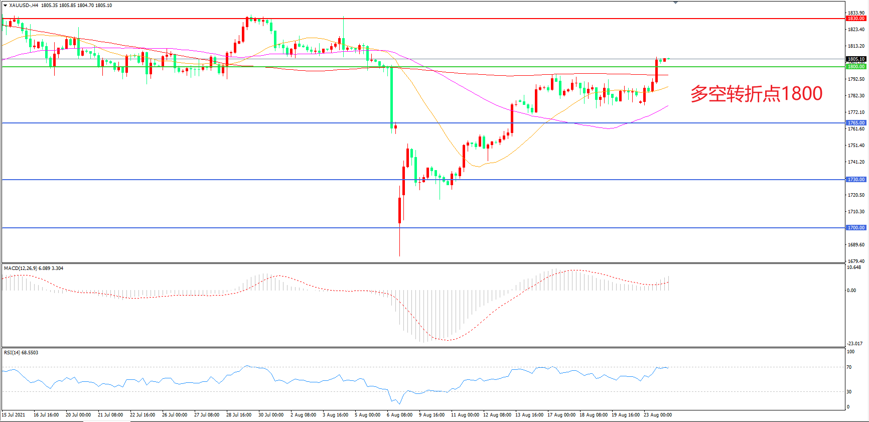 周一(8月23日),市场对美国货币政策方向的疑虑引发获利回吐,美元指数持续走低,现货黄金在重磅会议来临前强势爆发,日内涨逾1%后突破1800关口,收报1805.49美元/盎司。目前投资者正在急切地等待杰克逊霍尔研讨会,以寻找美联储缩减每月1200亿美元债券购买计划时间表的线索,如果鲍威尔讲话偏向鸽派,金价有望再次迎来大涨。