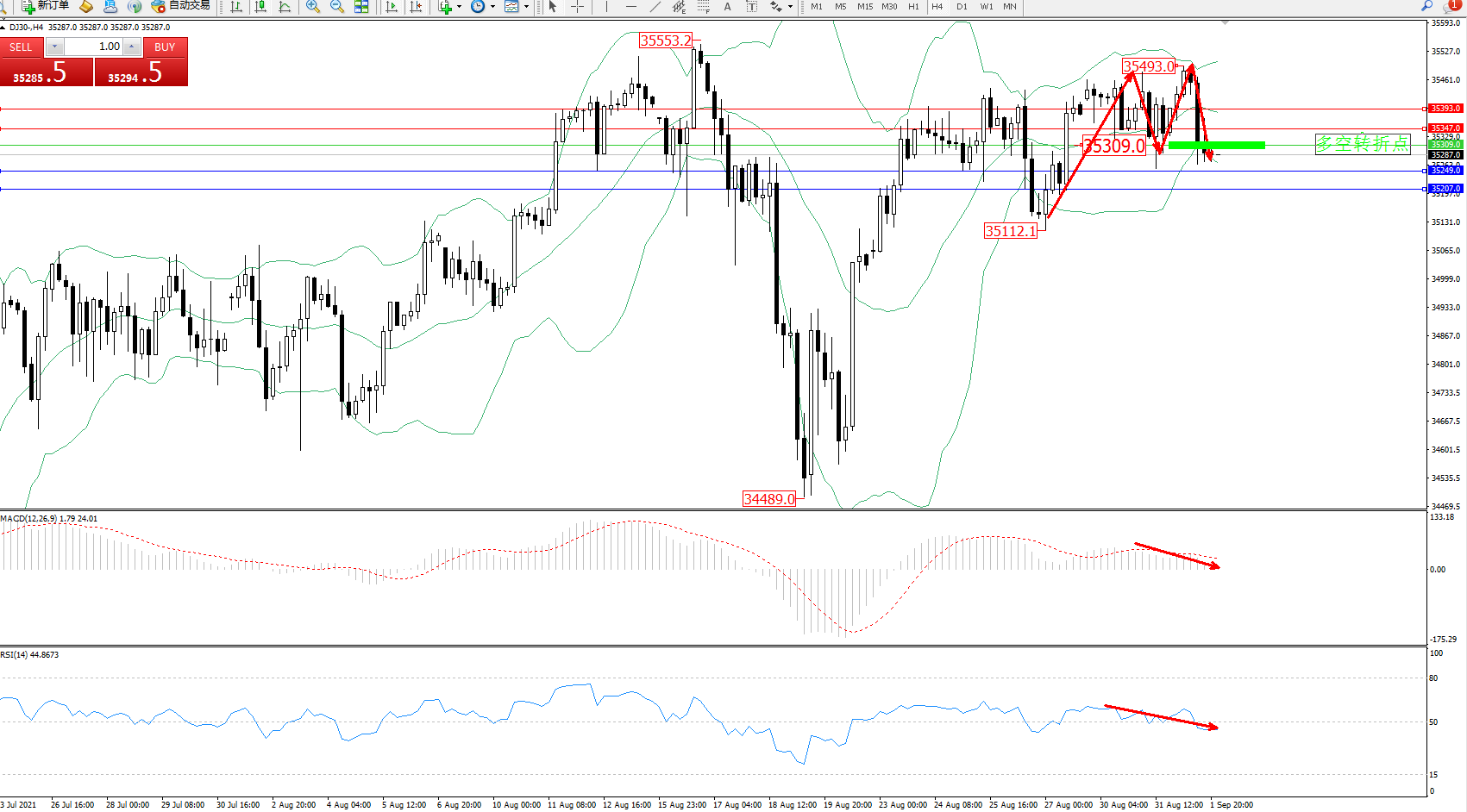 技术点评:长时间维持在布林带指标通道内持续宽幅震荡中,高位抵达35493位置后出现回撤,触及布林带指标下轨附近节点后有继续维持弱势整理迹象,布林带指标呈缓慢张口走势中,MACD指标纠结于0轴线上方弱势徘徊中,RSI指标处于50均衡线附近持续震荡;