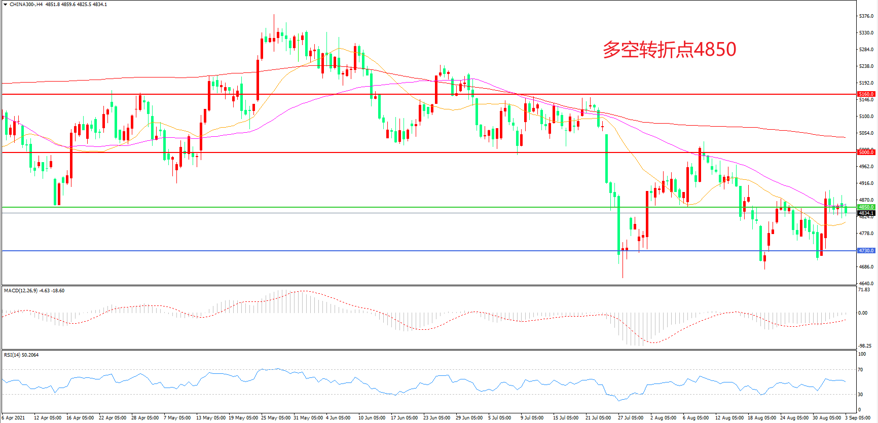 4小时图看,沪深300连续拉升后延续高位震荡,整体表现偏强,21周期均线成为支撑,4850成为短期多空分水岭,MACD绿柱缩短,RSI指标走平,日内震荡上行概率较大。