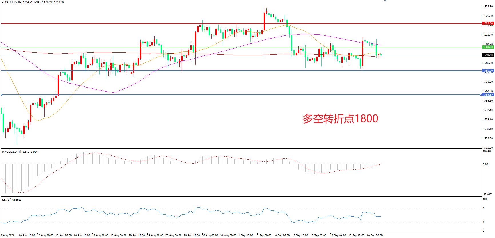 4小时图看,金价长阳拉升后受阻于55周期均线,上行趋势受阻,21周期均线成为下方支撑,1800成为多空分水岭,MACD绿柱缩短,RSI指标走平,日内震荡上行概率较大。