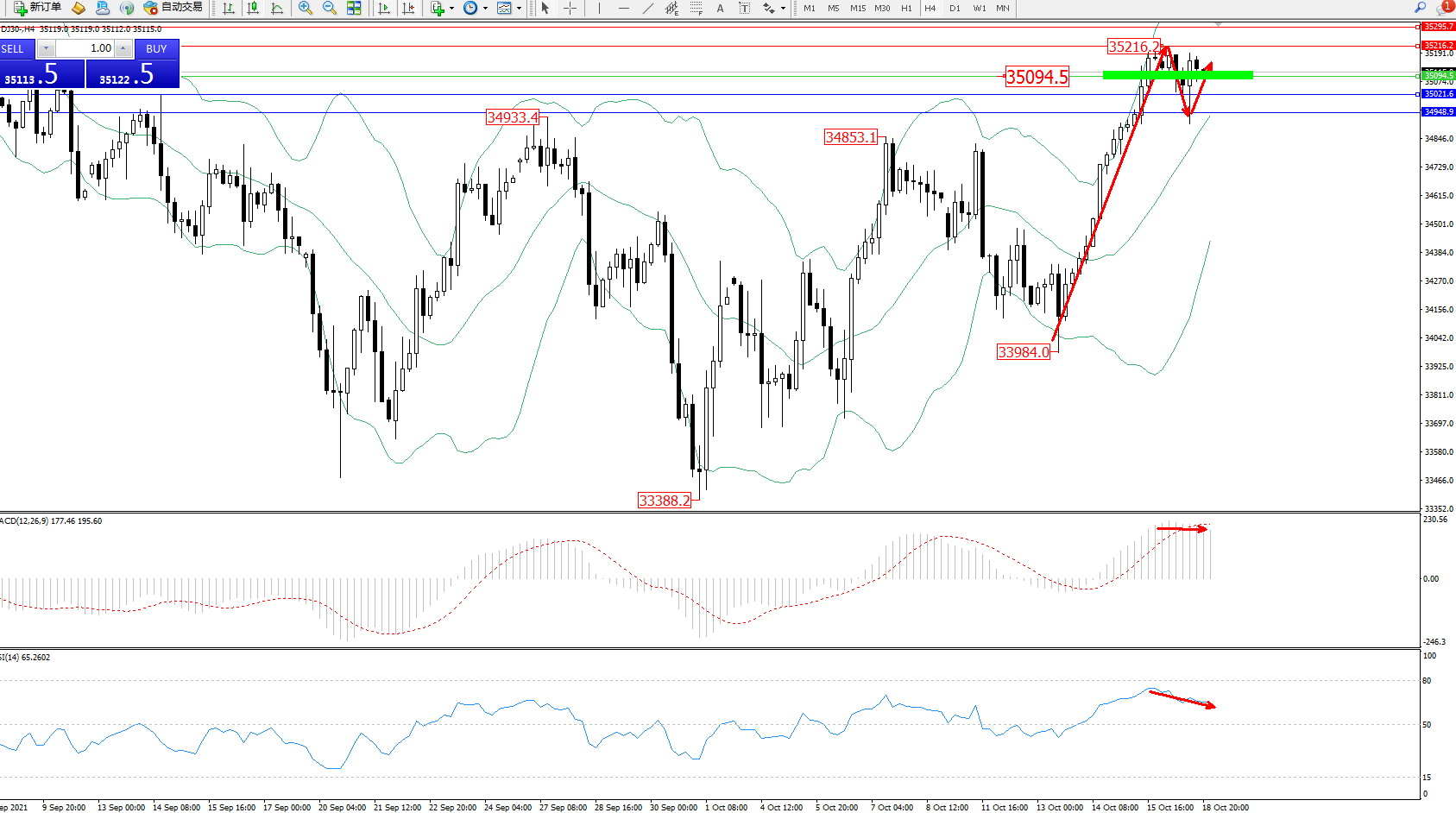 技术点评:多头动力延续布林带指标通道中上轨区间持续震荡上扬,高位抵达35216位置后遇阻开始震荡整理,短期开始缓慢回撤,布林带指标呈收口走势持续上移中,MACD指标处于多头区域维持平移,RSI指标处于多头区域维持弱势整理缓慢下移;