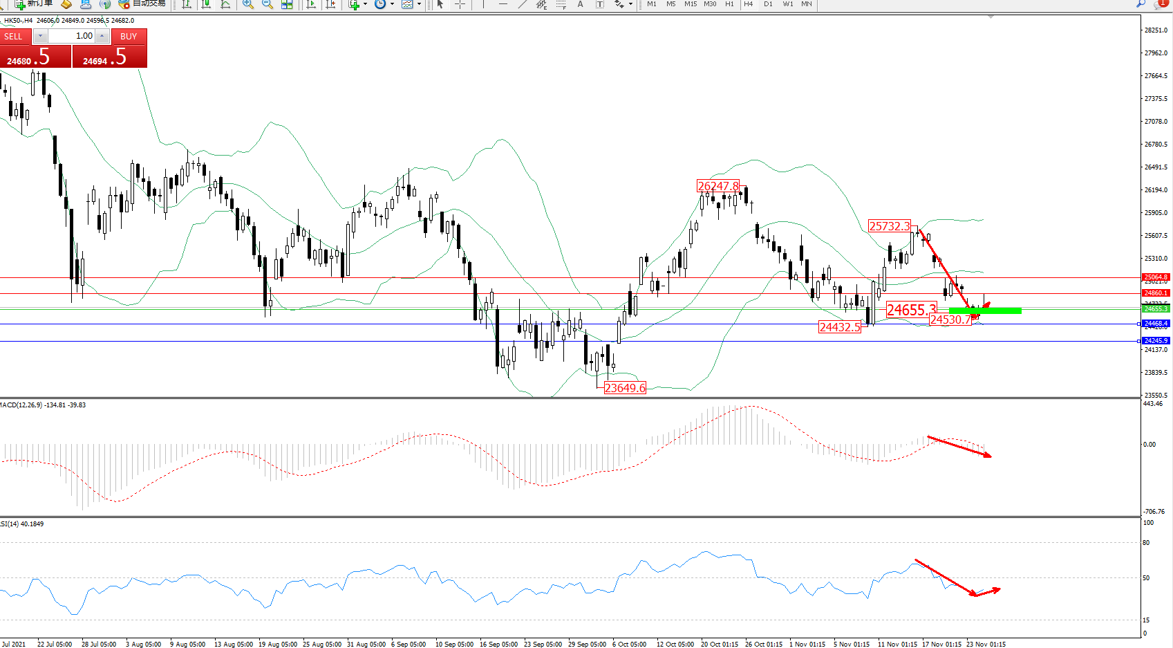 技术点评:空头动力维持震荡下行,触及布林带指标下轨附近24530位置后开始得到支撑反转上移,多头动力伺机入场,布林带呈收口走势持续平移,MACD指标处于0轴线下方维持弱势整理下行,RSI指标空头动力持续震荡下行后开始缓慢整理有上移迹象;
