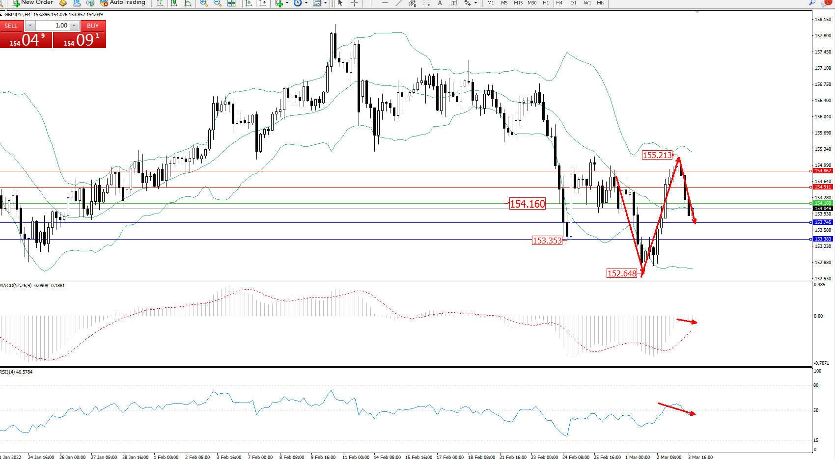 技术点评:空头动力强势震荡下挫,低位152.648附近得到支撑再度拉升上扬,高位抵达155.213位置后遇阻回撤,短期或纠结于布林带指标通道内宽幅震荡,布林带指标呈收口走势持续平移中,MACD指标处于空头区域维持震荡上移至0轴线下侧开始弱势徘徊,RSI纠结于50均衡线下侧窄幅整理;