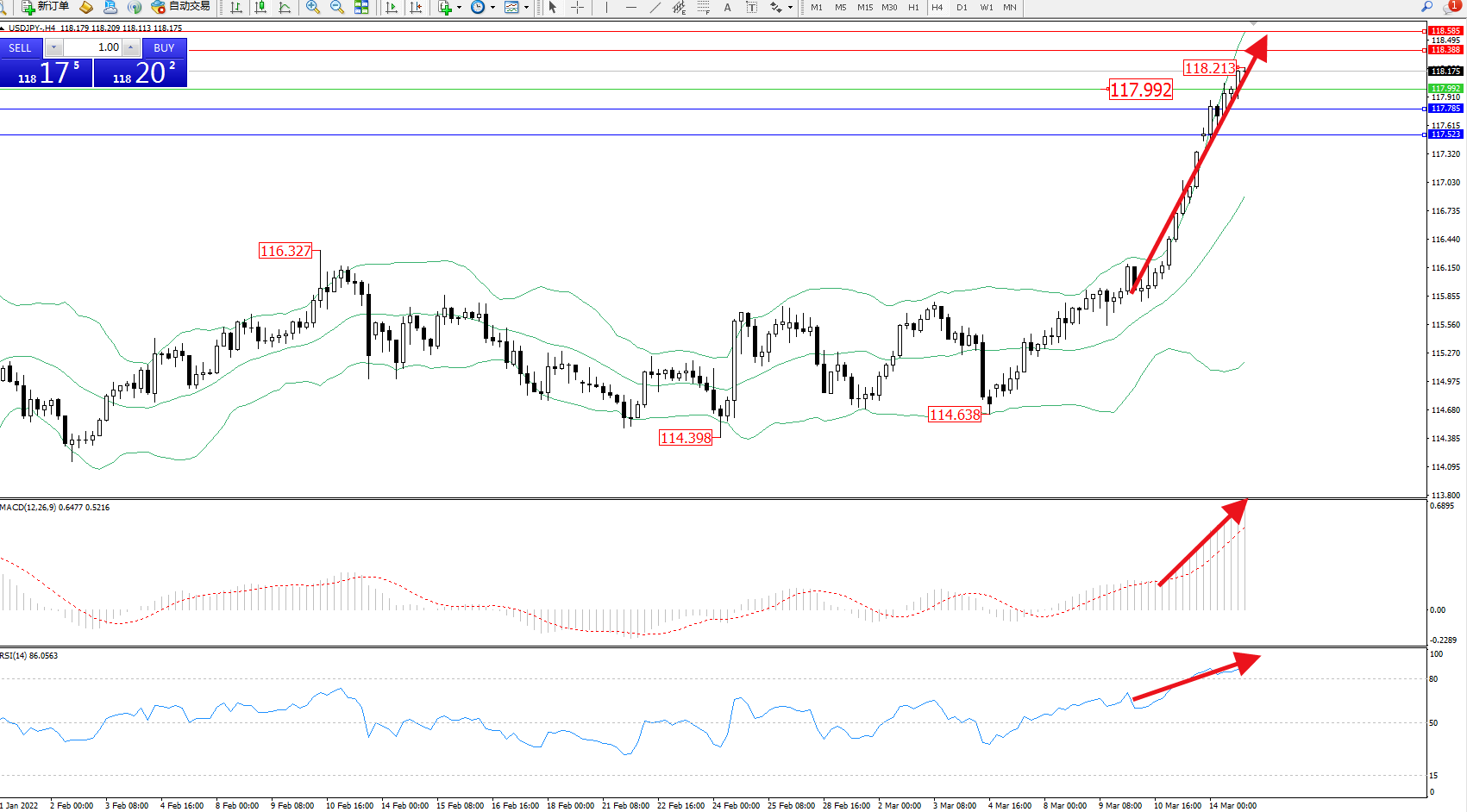 交易策略:117.992上方看涨,目标118.388、118.585