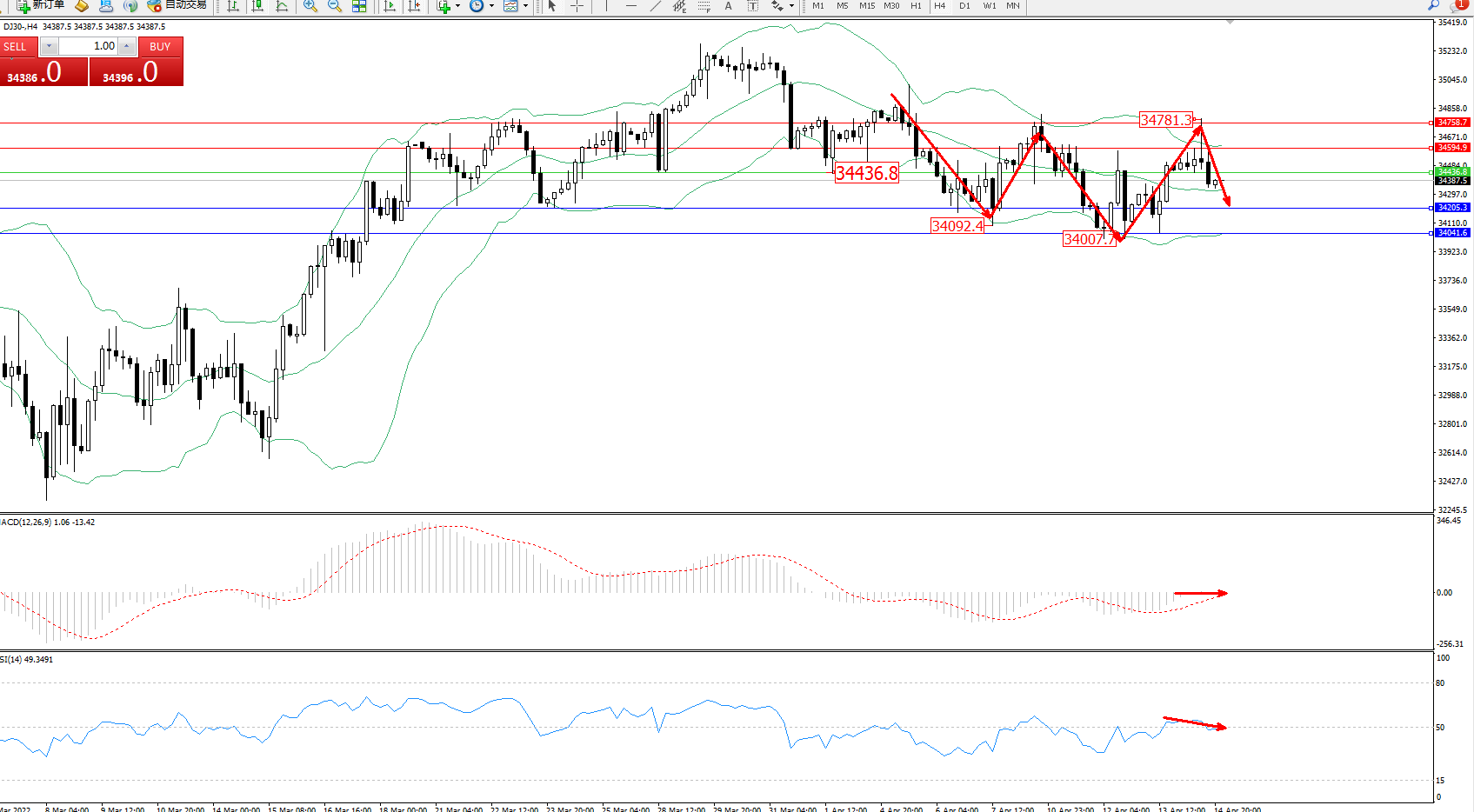 技术点评:长时间维持在布林带指标通道内维持宽幅震荡,期间多次来回刺探上下轨区间节点,突破布林带指标上轨至34781附近节点后遇阻回撤,短期空头动力入场下行,布林带指标呈收口平移中,MACD指标处于0轴线附近弱势徘徊中,RSI指标处于50均衡在线方窄幅整理中;