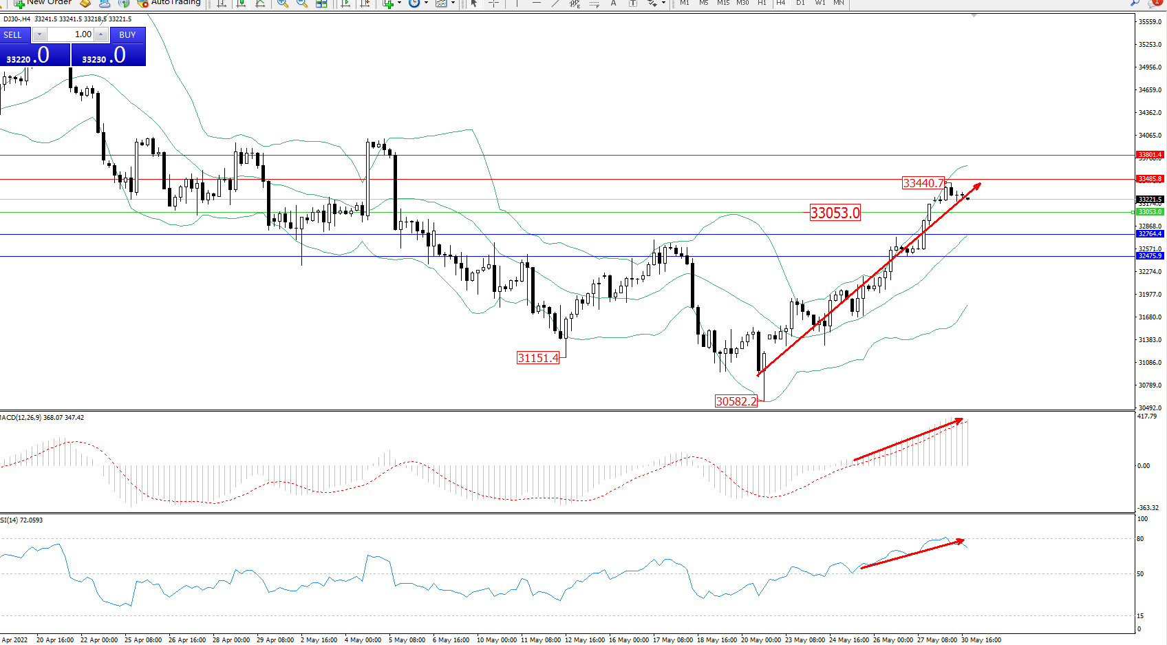 纽约交易所阵亡将士纪念日,休市一日。道琼斯指数5月27日(周五)收盘上涨576.36点,涨幅1.77%,报33213.55点;美股收盘,三大股指高收,道指初步收涨,数据显示通胀持续高压之际消费者的支出仍强劲,是企业利润前景的利好;PCE物价指数较3月增长有所放缓,虽仍接近四十年来增速高位,但市场猜测可能是通胀见顶迹象,美联储加息步伐有望稍缓,美元指数和美国债收益率回软,大型科技股、半导体股走强。