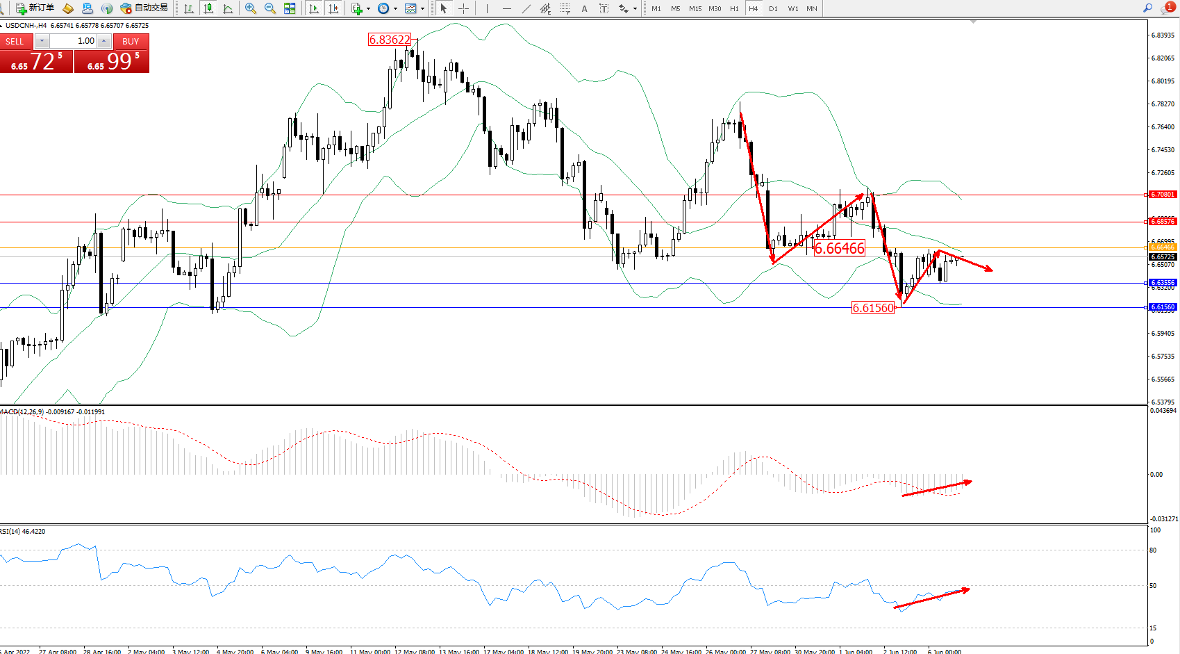 交易策略:6.66466下方看跌,目标 6.63556、6.61560