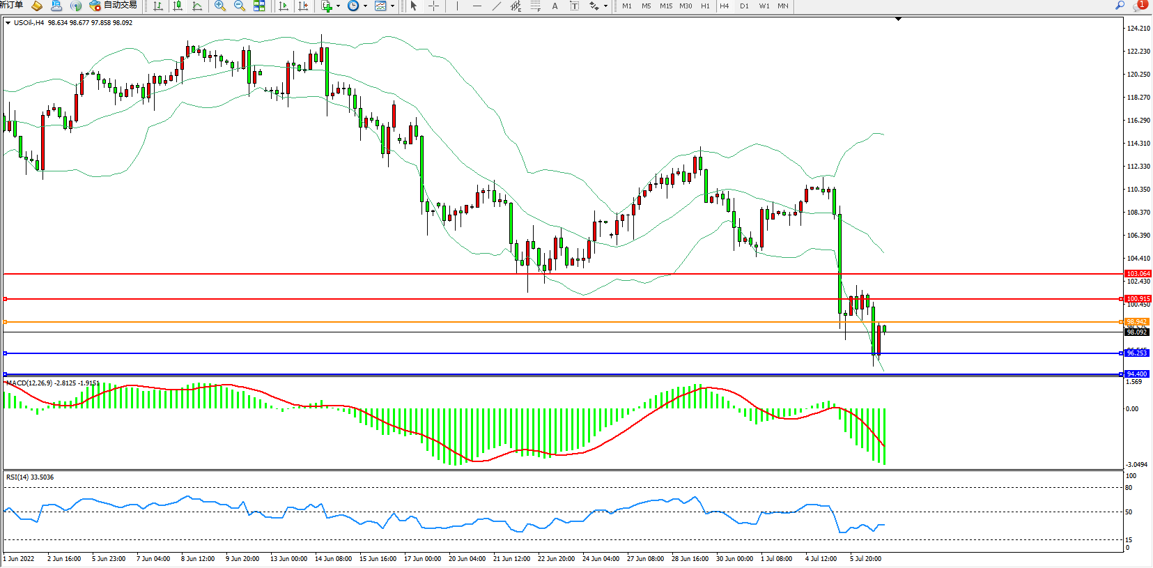 原油维持弱势下行至98.092附近震荡,日本提议将俄罗斯石油价格限制在目前水平的一半左右。对此,俄罗斯前总统梅德韦杰夫警告称,此举将导致市场上石油供应大幅减少,并将价格推高至每桶300美元甚至400美元不止。