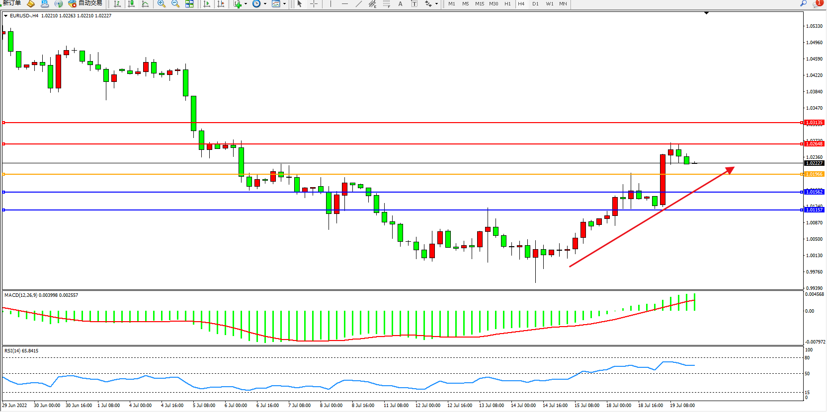 欧元美元EURUSD—4小时K线图显示: