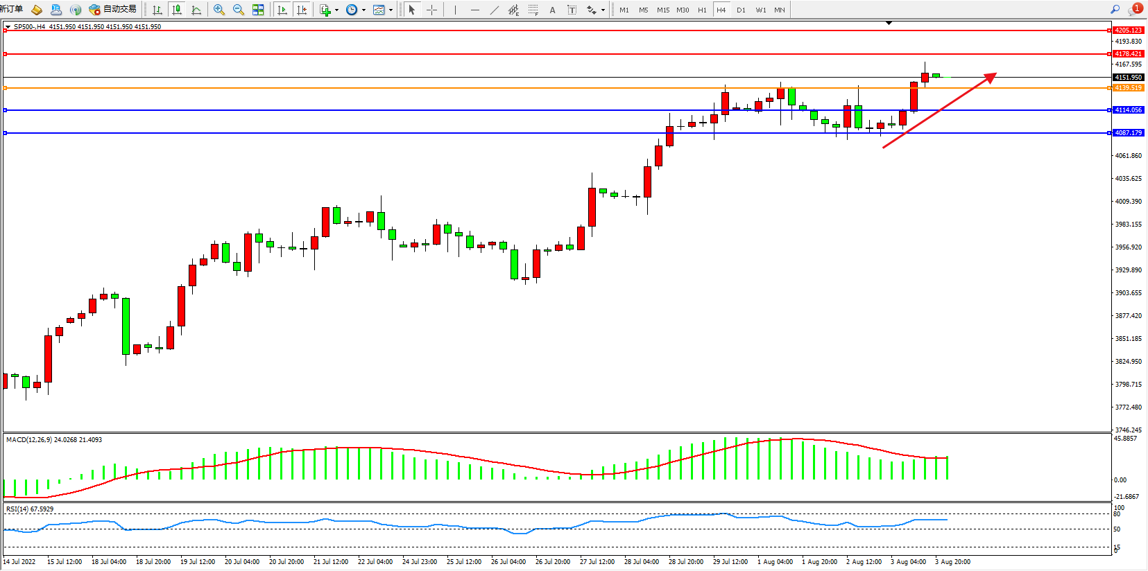 标普500指数8月3日(周三)收盘上涨62.57点,涨幅1.53%,报4153.76点;国7月Markit服务业PMI终值:收紧的金融环境意味着,金融服务行业正在引领经济放缓,美联储将进一步大幅加息,因为该数据可能会加剧经济低迷。