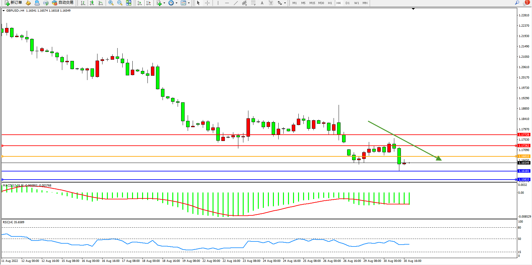 交易策略:1.16810下方看跌,目标1.16181、1.15833