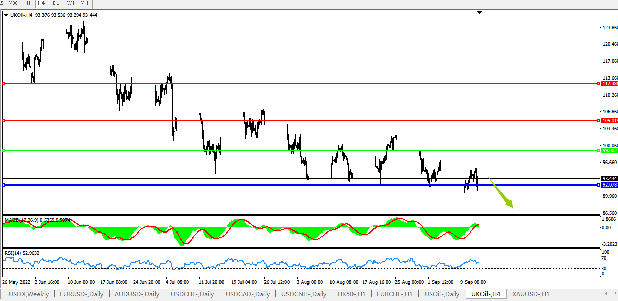 4小时图看:短线价格冲高后开始回落,中期图形结构中性, MACD量能柱0轴上小幅缩量,RSI整理偏弱,短期油价反弹后再度下行概率较大。