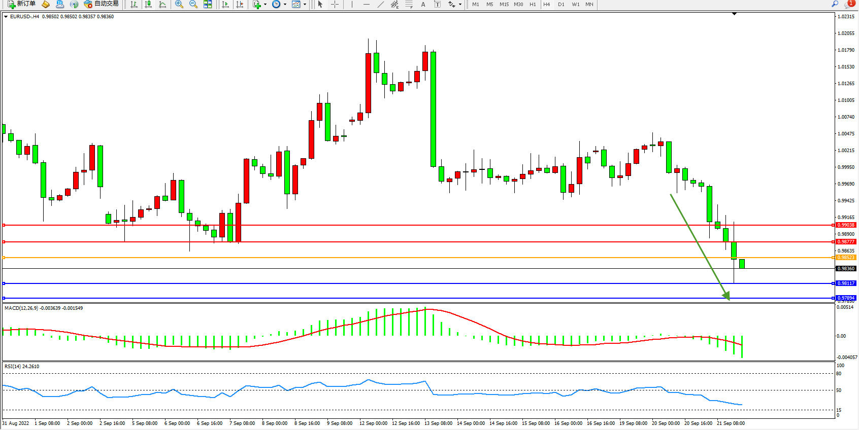 欧元美元EURUSD—4小时K线图显示:
