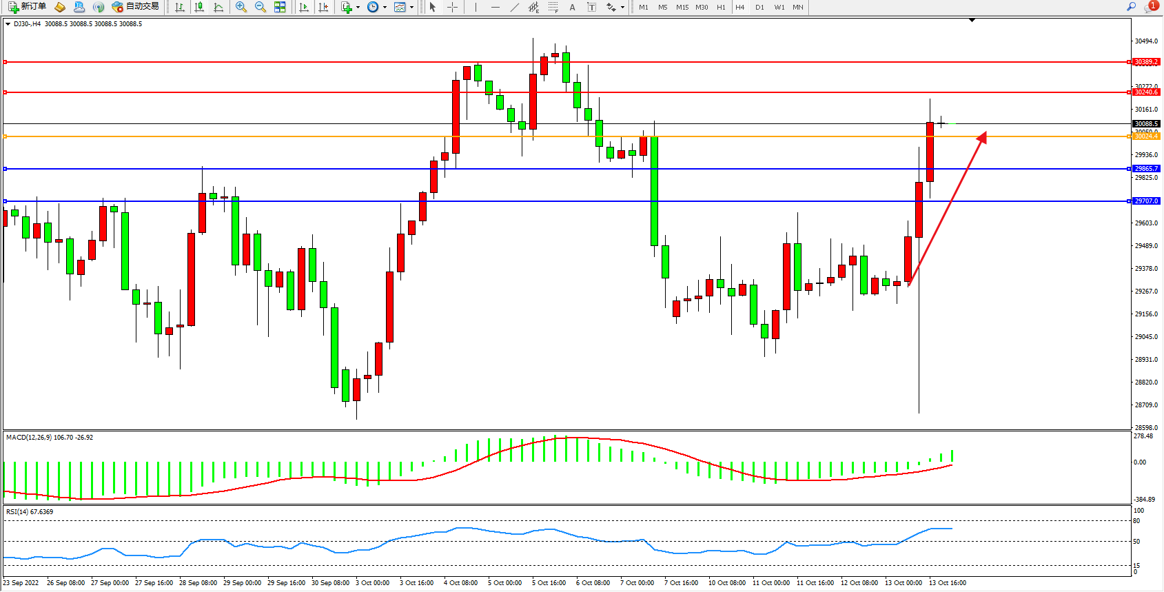 道琼斯指数10月13日(周四)收盘上涨827.34点,涨幅2.83%,报30038.19点;美国9月未季调CPI年率小幅回落至 8.2%,为2022年2月以来最小增幅。