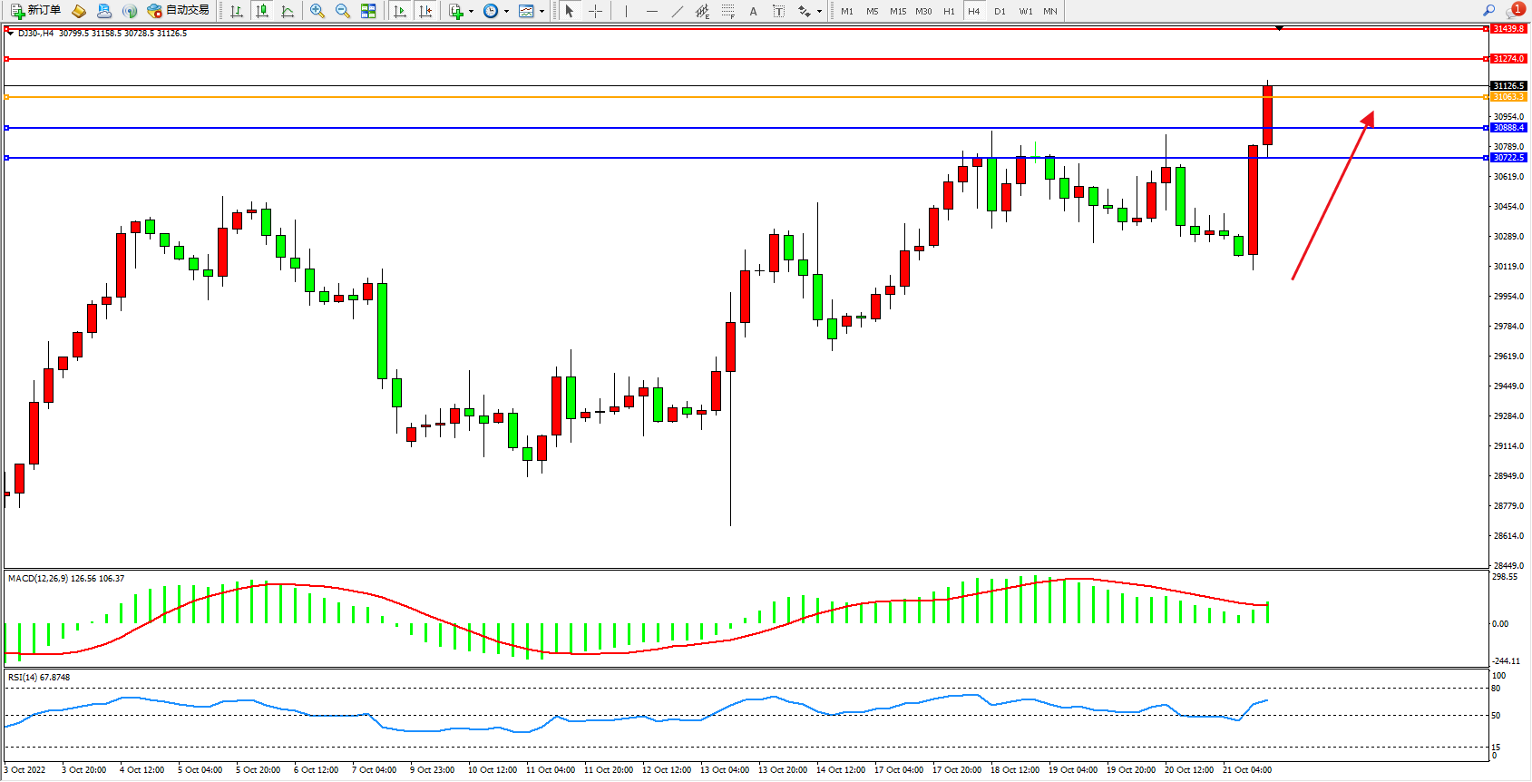 4小时图看:多头动力高位持续震荡后,急速拉升,短期多头动力有继续上扬态势,MACD指标处于0轴线市场震荡,RSI指标处于50均衡线上側上移中;