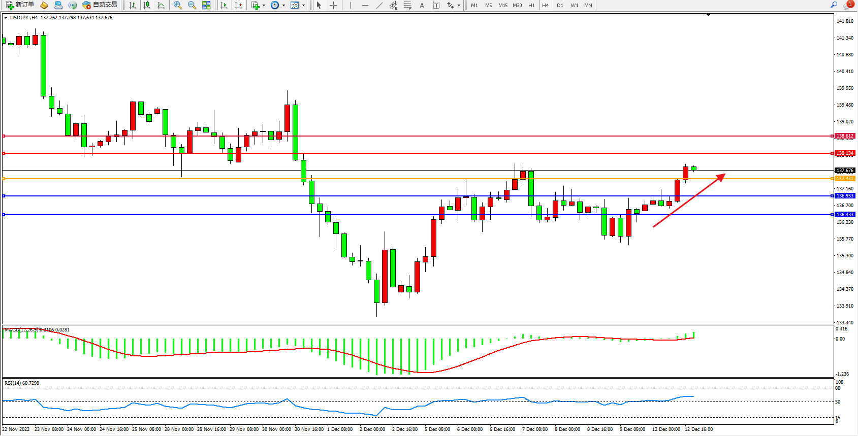 4小时图看:多头大了维持窄幅整理后缓慢上行,短期看涨情绪涌现,上側多头缓慢上行,MACD指标处于0轴线上側弱势徘徊,RSI指标处于50均衡线上側窄幅整理;