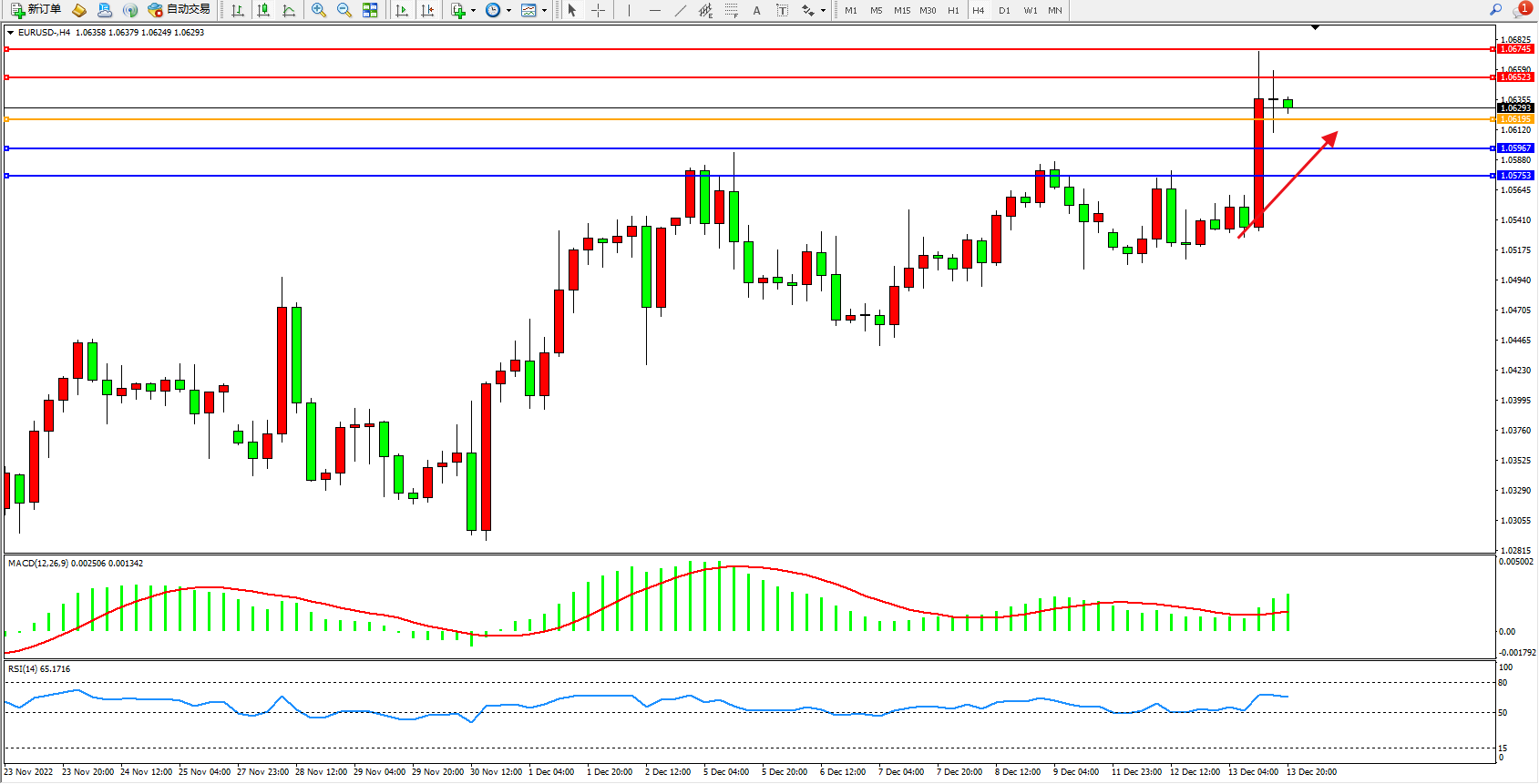 欧元美元EURUSD—4小时K线图显示: