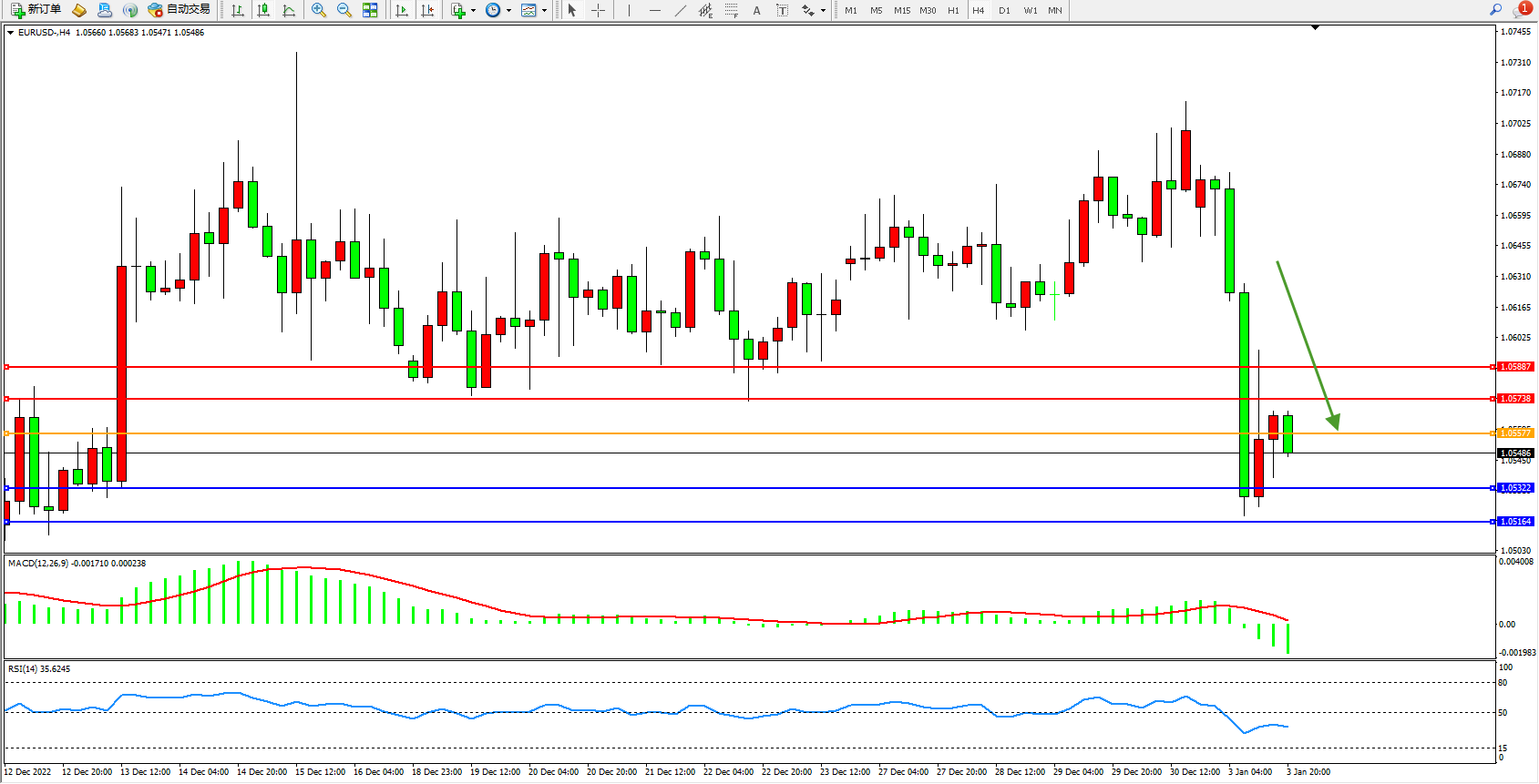 欧元美元EURUSD—4小时K线图显示:
