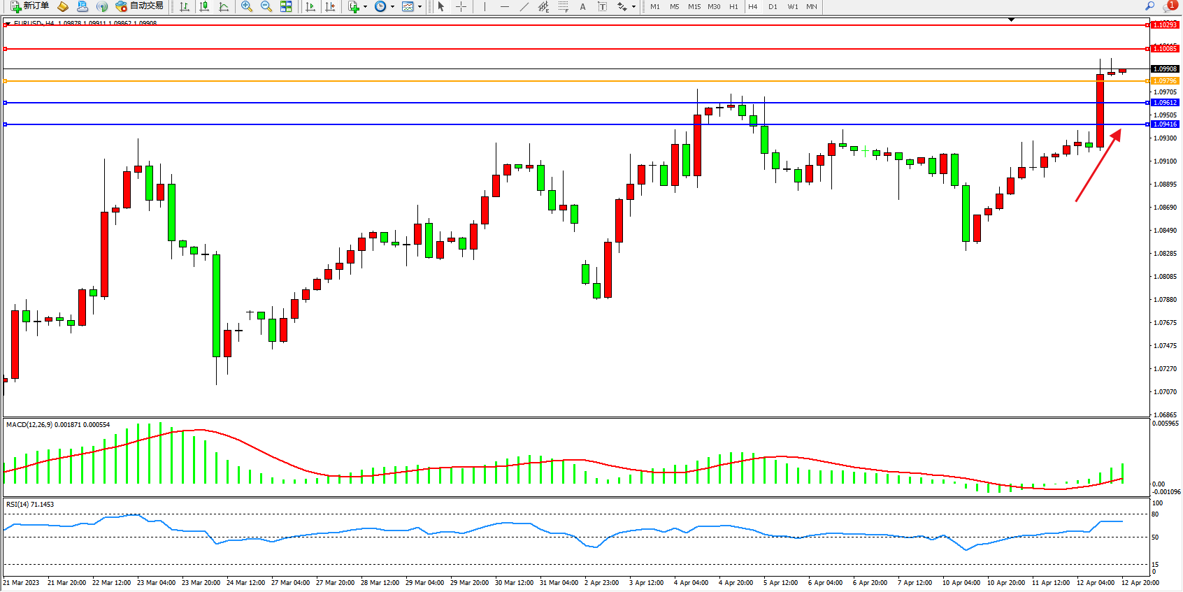 欧元美元EURUSD—4小时K线图显示: