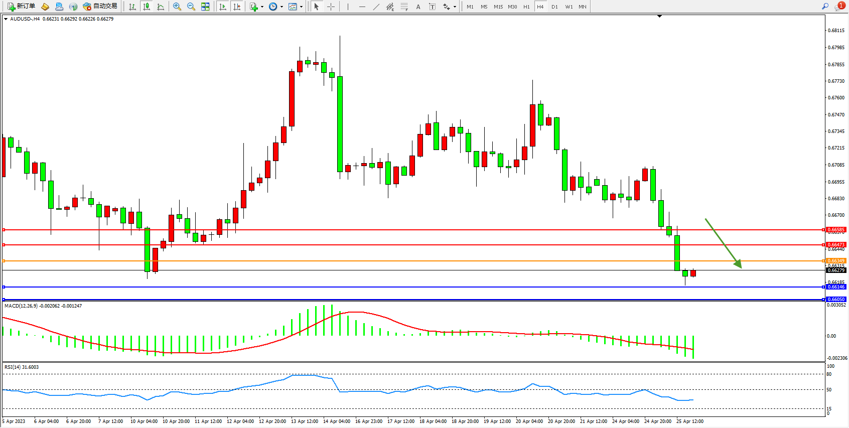 交易策略:0.66349下方看跌,目标0.66146  0.66050