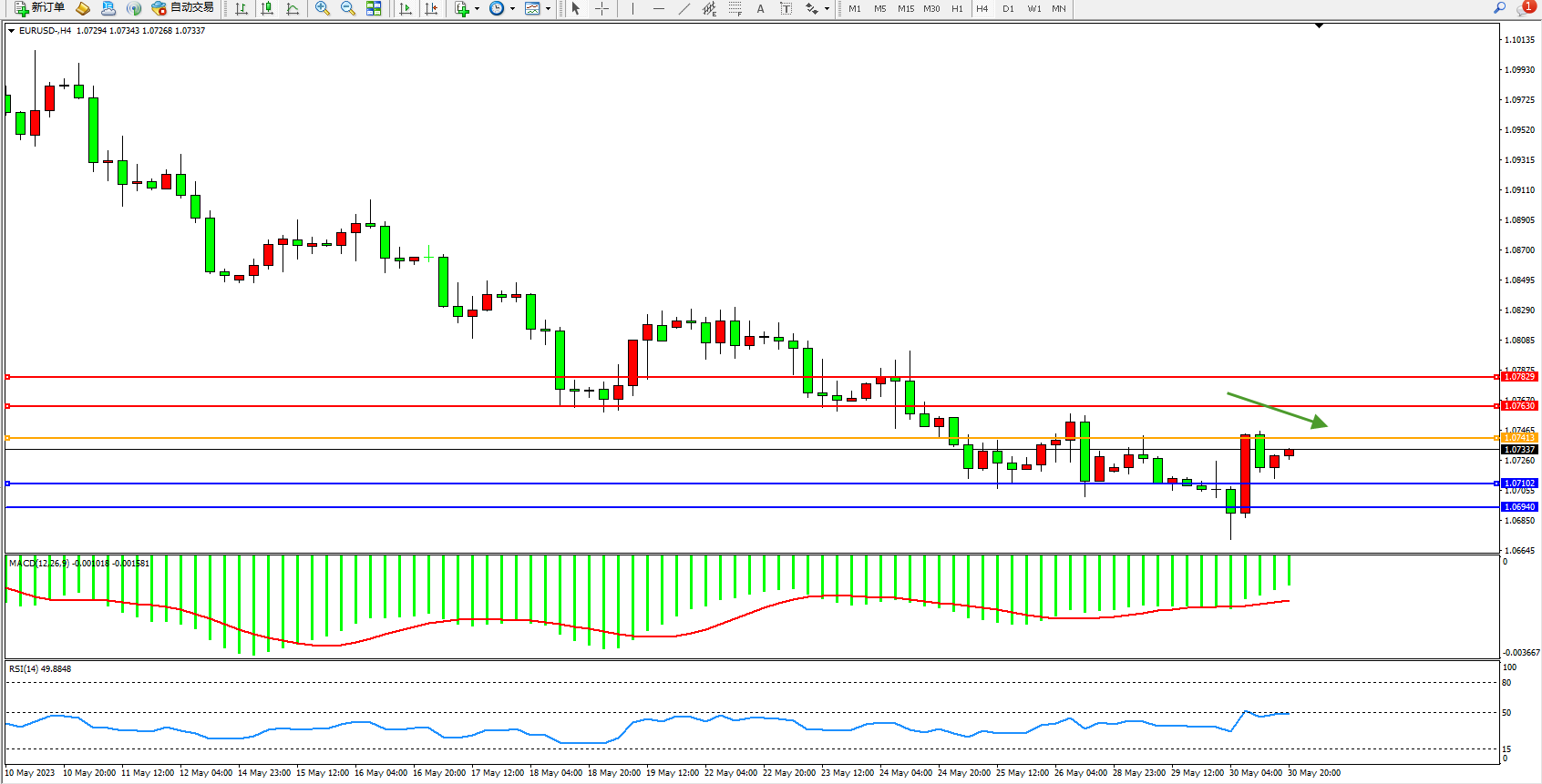 欧元兑美元维持1.07337附近震荡,市场对欧洲央行利率的预期赶上核心通胀上升的现实,否则欧元兑美元可能难以走出近期的交易区间。欧洲央行行长拉加德将在周四发表讲话,5月会议纪要也在周四公布,这些都是关键。