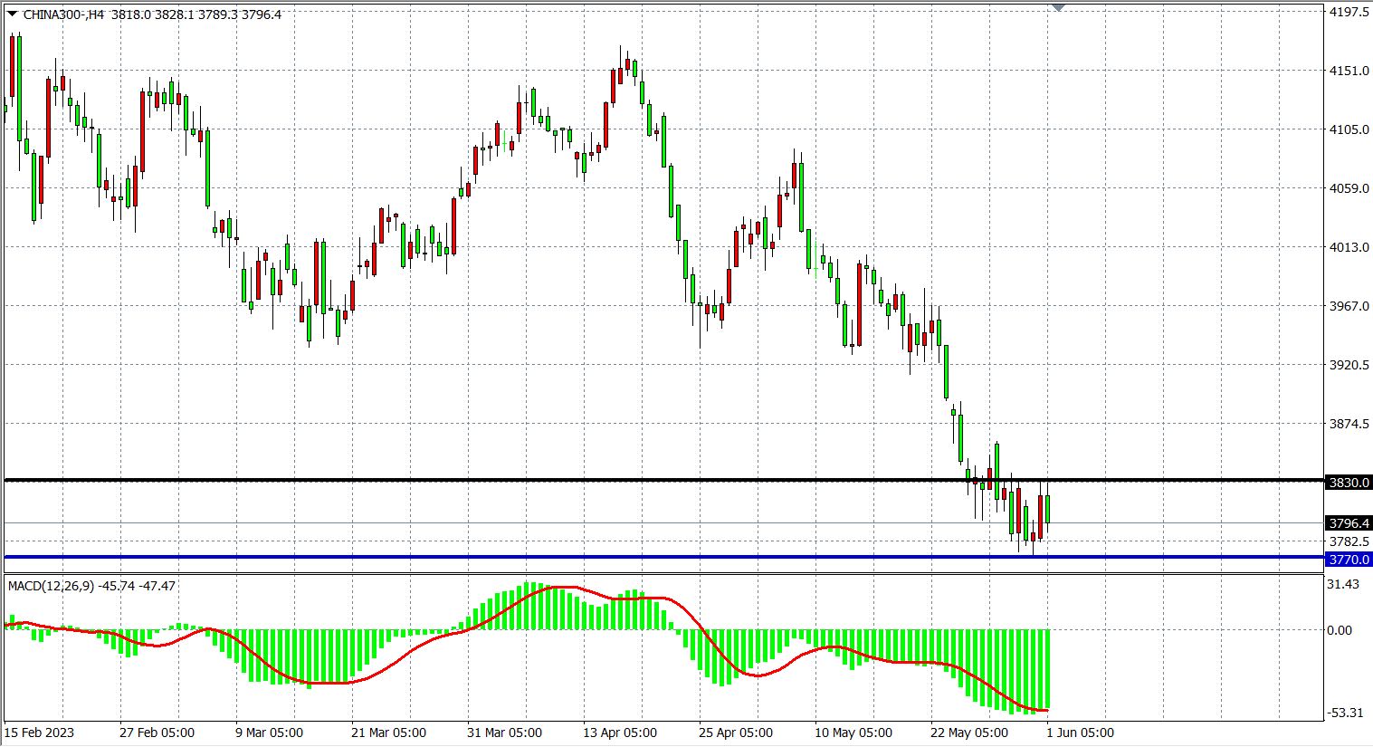 4小时图看,沪深300继续低位盘整,支撑在3770附近,阻力于3830附近,MACD量能在零轴下继续放量,趋势继续维持空头下行,在3830之下继续看空为主。
