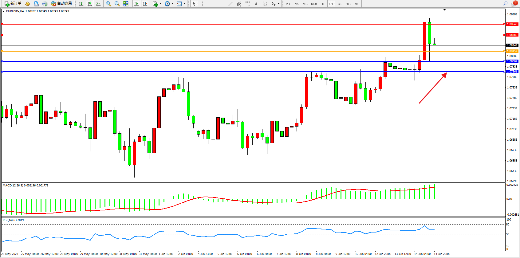 欧元美元EURUSD—4小时K线图显示: